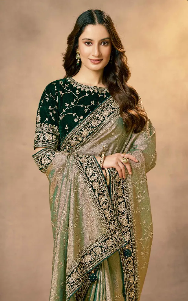 Two-Tone Colors: The beautiful combination of soft beige and rich green makes this saree look very traditional yet fresh.
