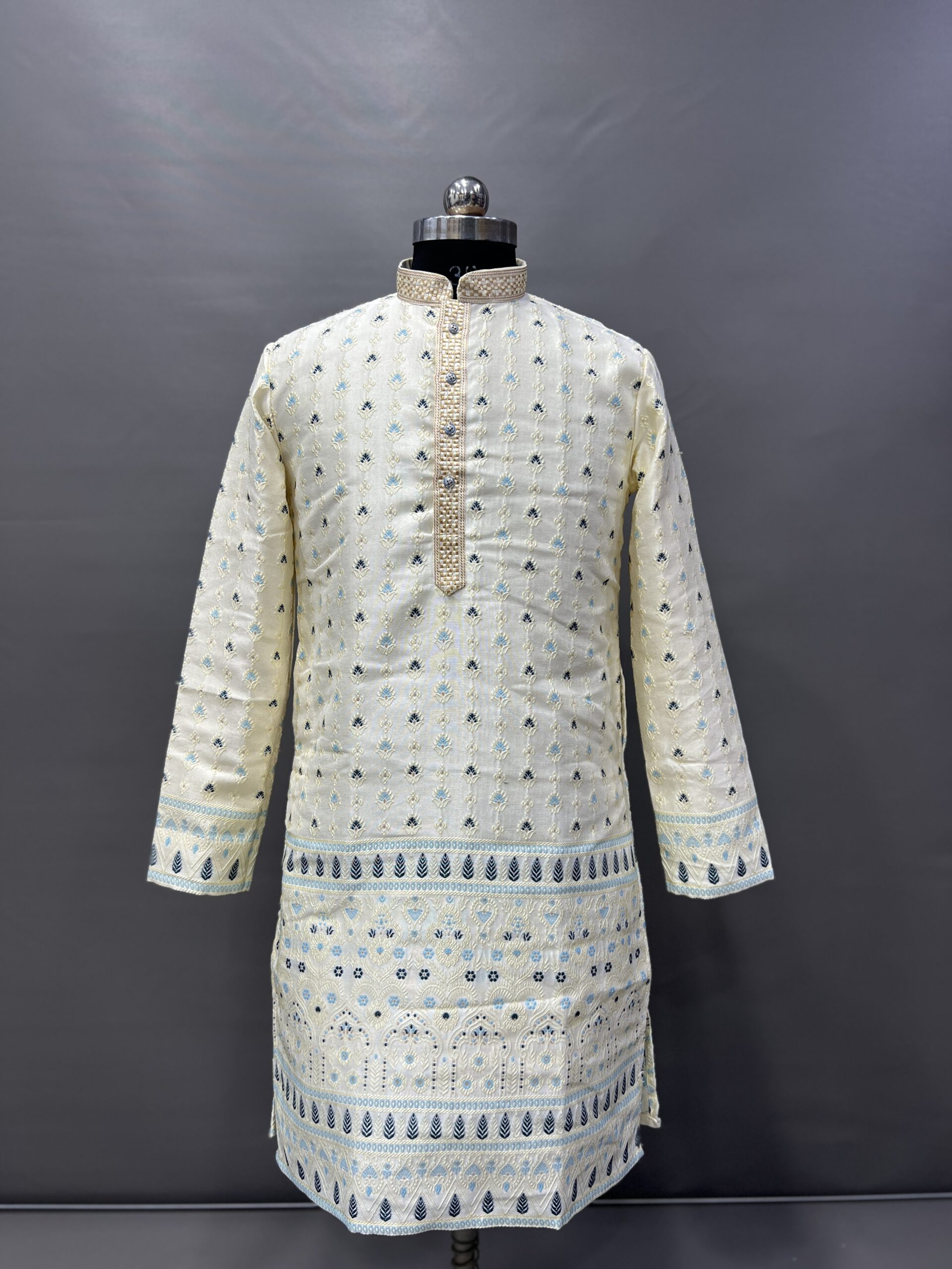 Beige Jacquard Amboj Work Men’s Kurta Pyjama