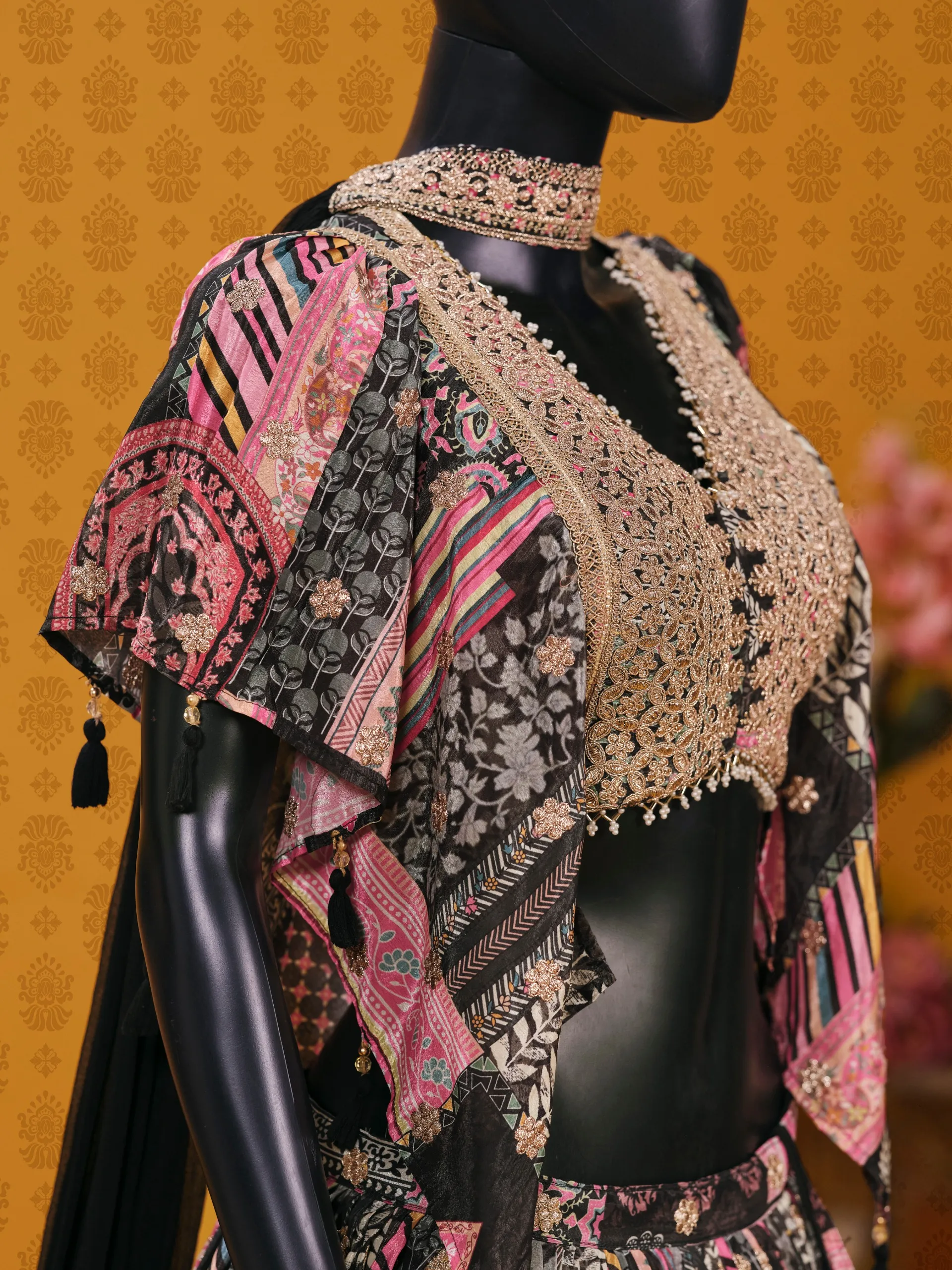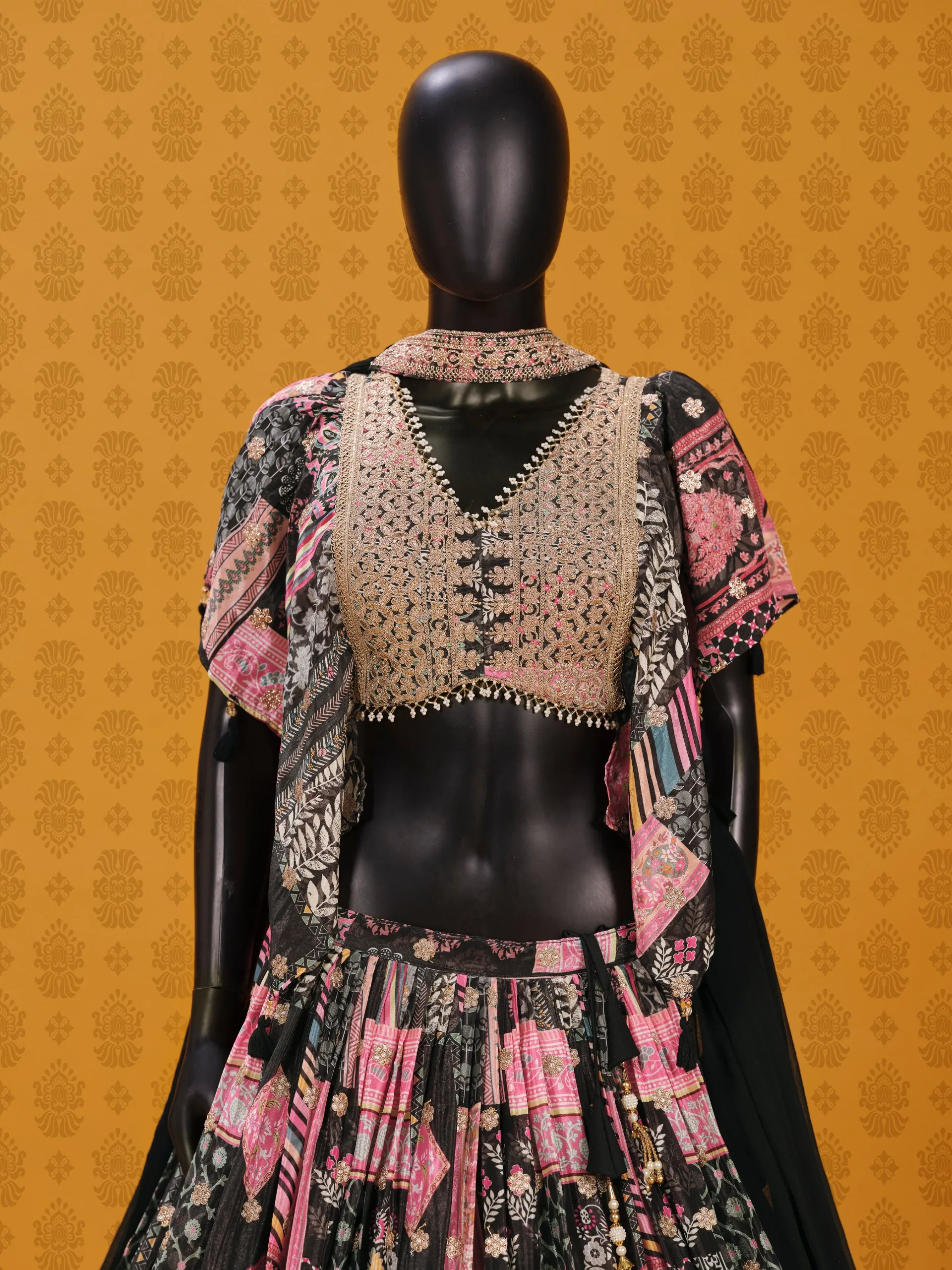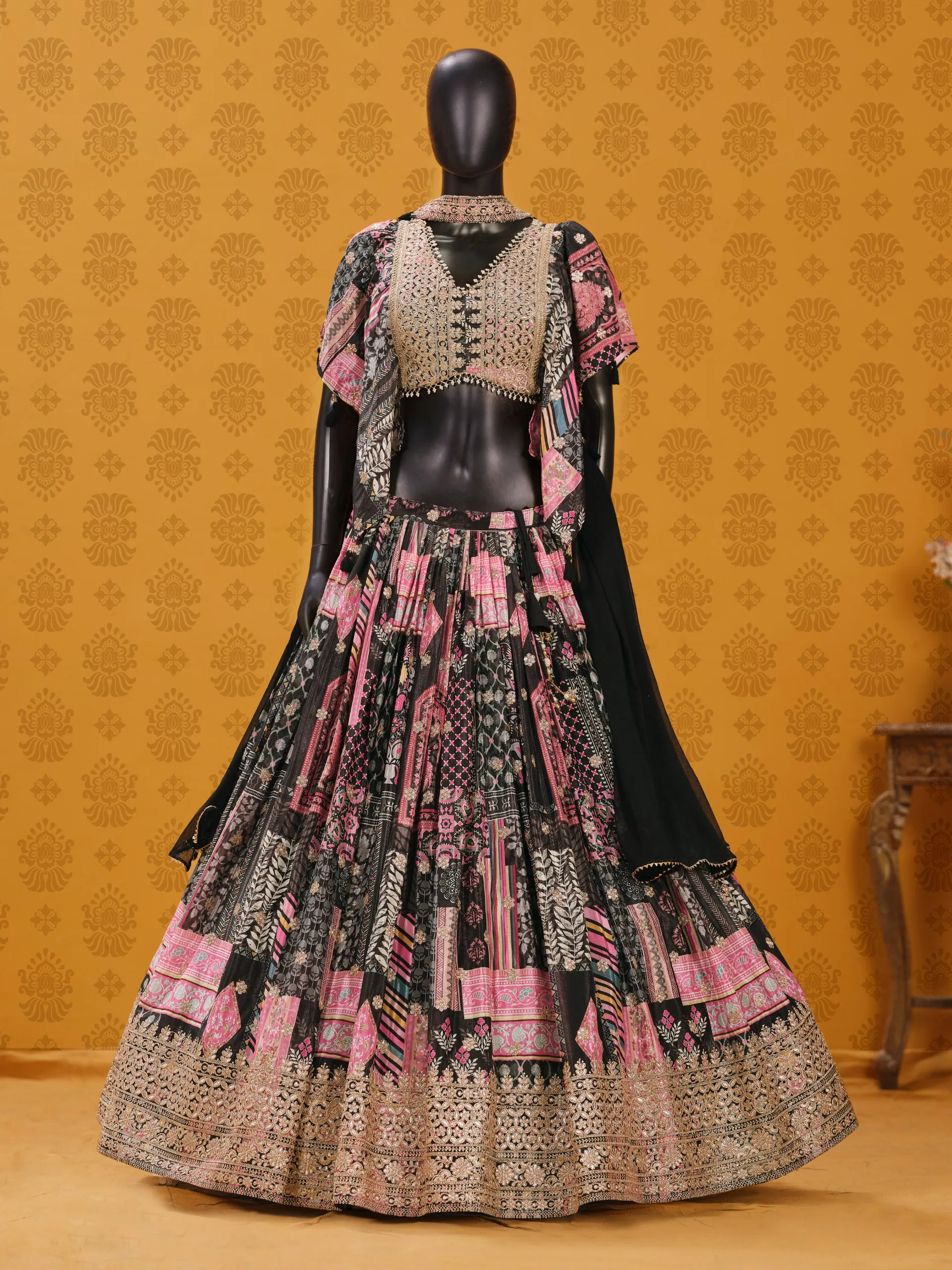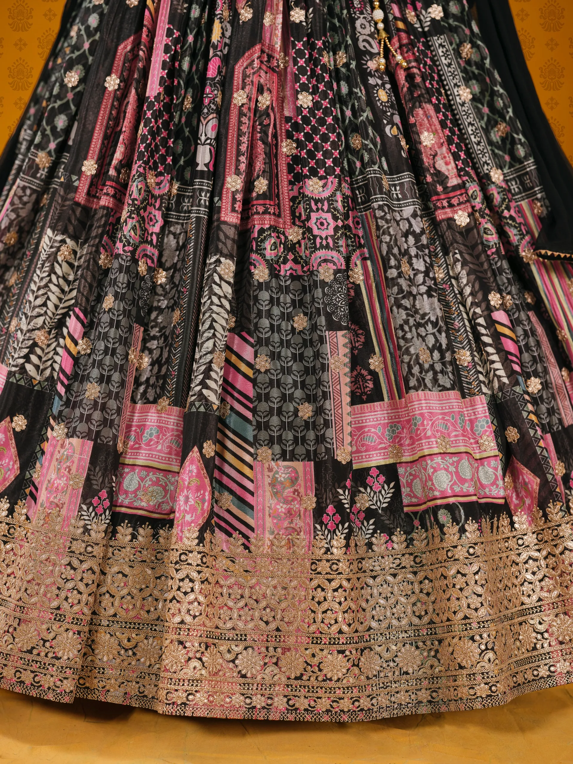 Black Chinon Silk Multicolor Patchwork Printed Partywear Lehenga