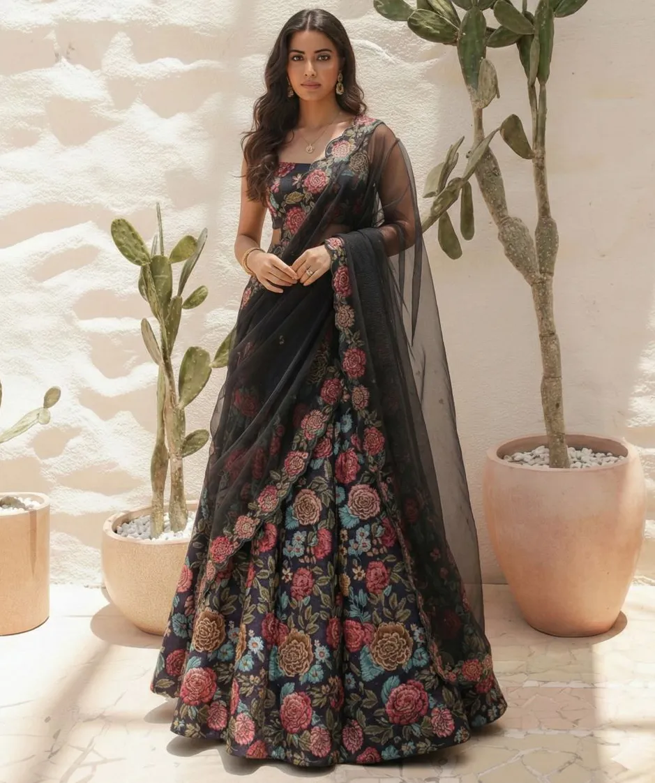 The Fabric (Georgette): The skirt (Lehenga) and scarf (Dupatta) are made of Georgette. This fabric is very light and moves beautifully when you walk.