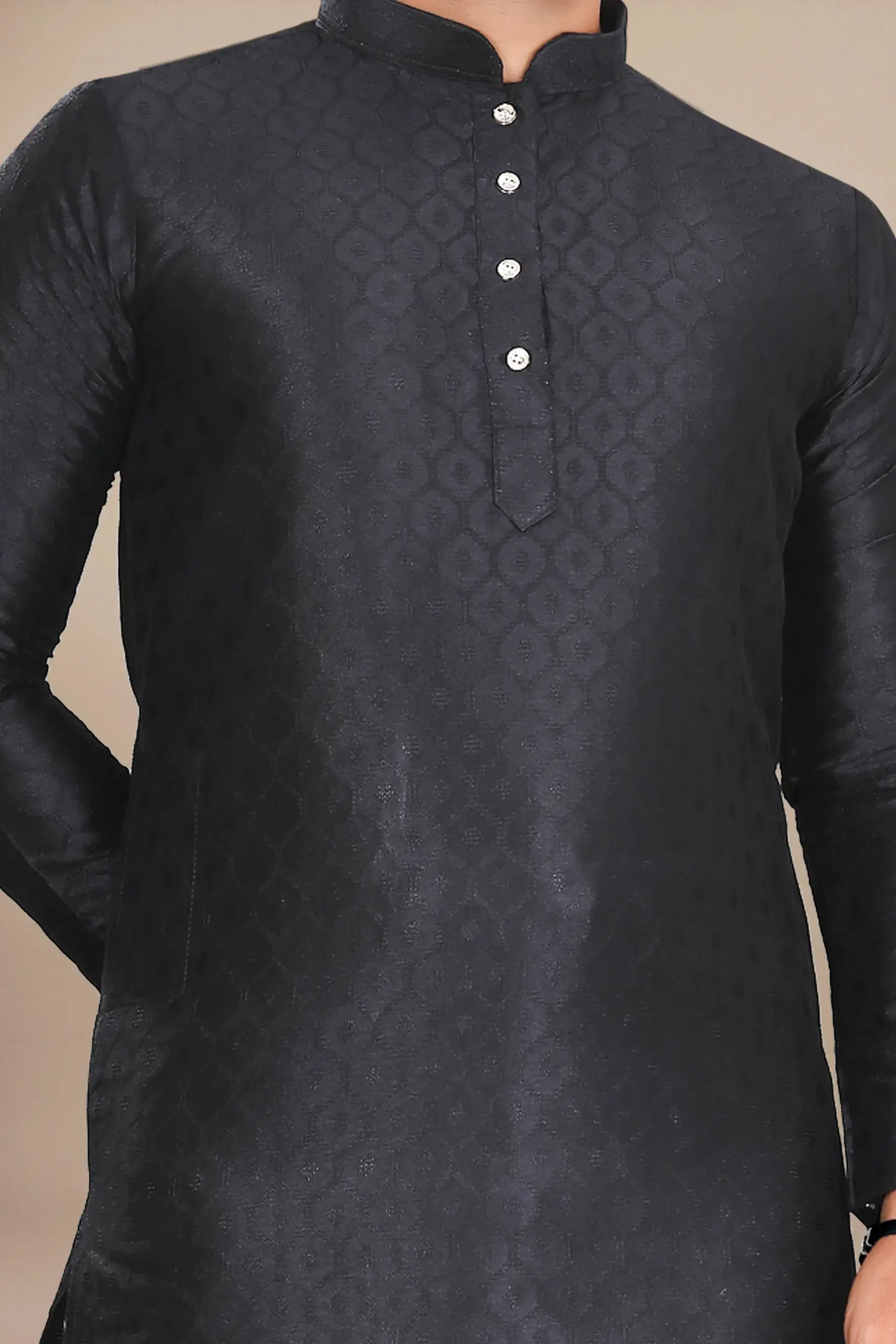 Kurta Fabric and Color: The Kurta is crafted from Jacquard fabric, which features intricate patterns woven directly into the rich Black fabric. This woven pattern adds texture, depth, and a high-end feel without the need for heavy surface embroidery.