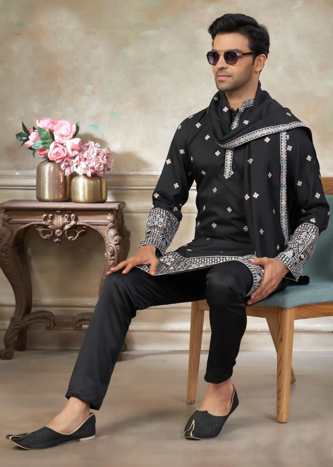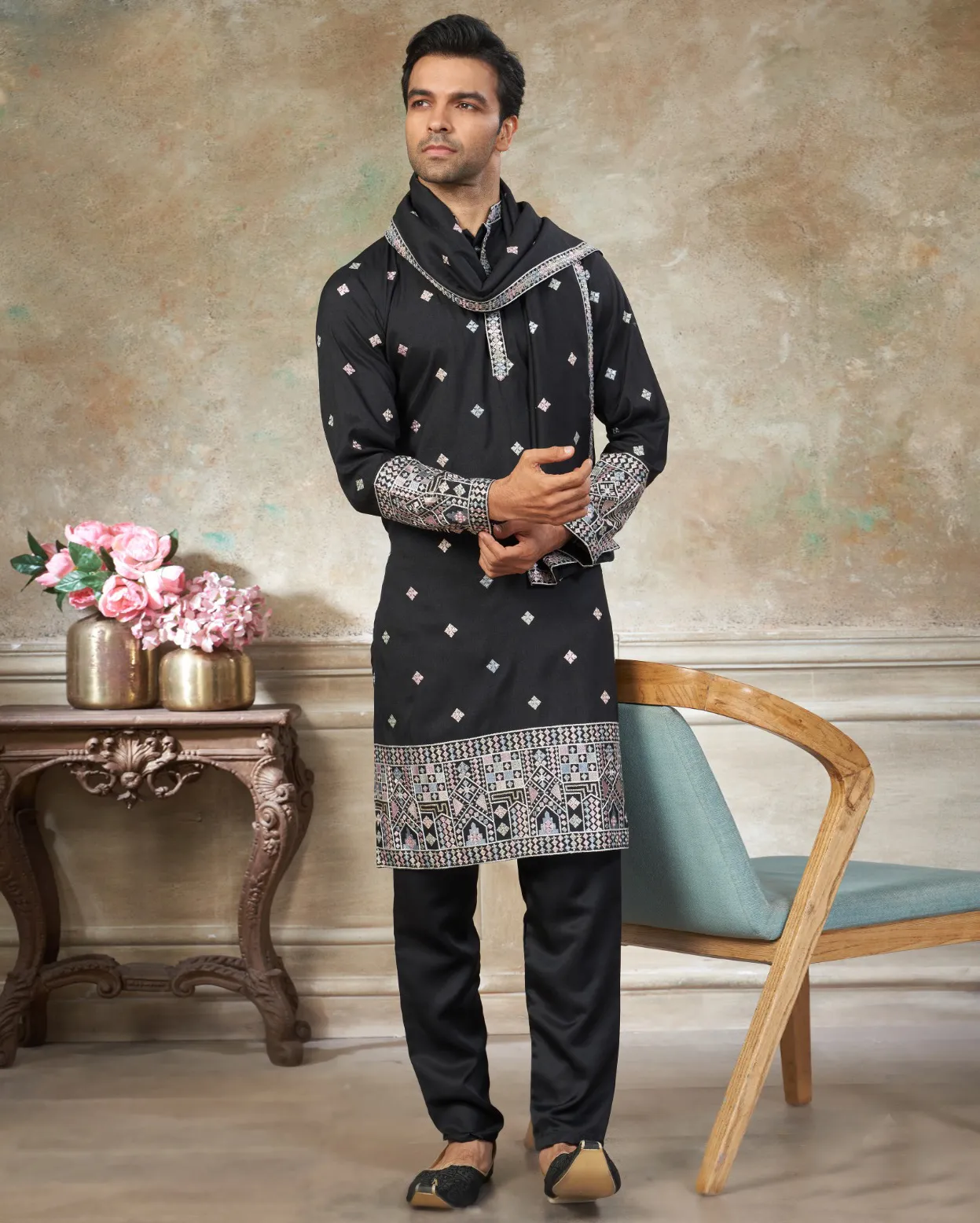 Black Pure Silk Embroidered Men’s Kurta Pajama Set With Silk Dupatta