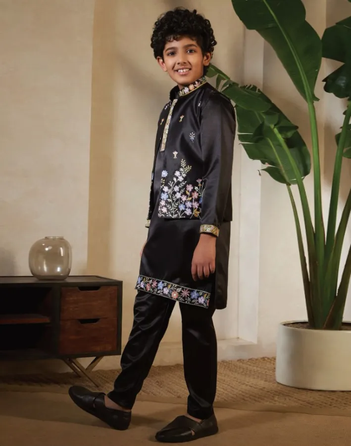 Black Satin Sequins Embroidered Kid’s Waistcoat Kurta Set
