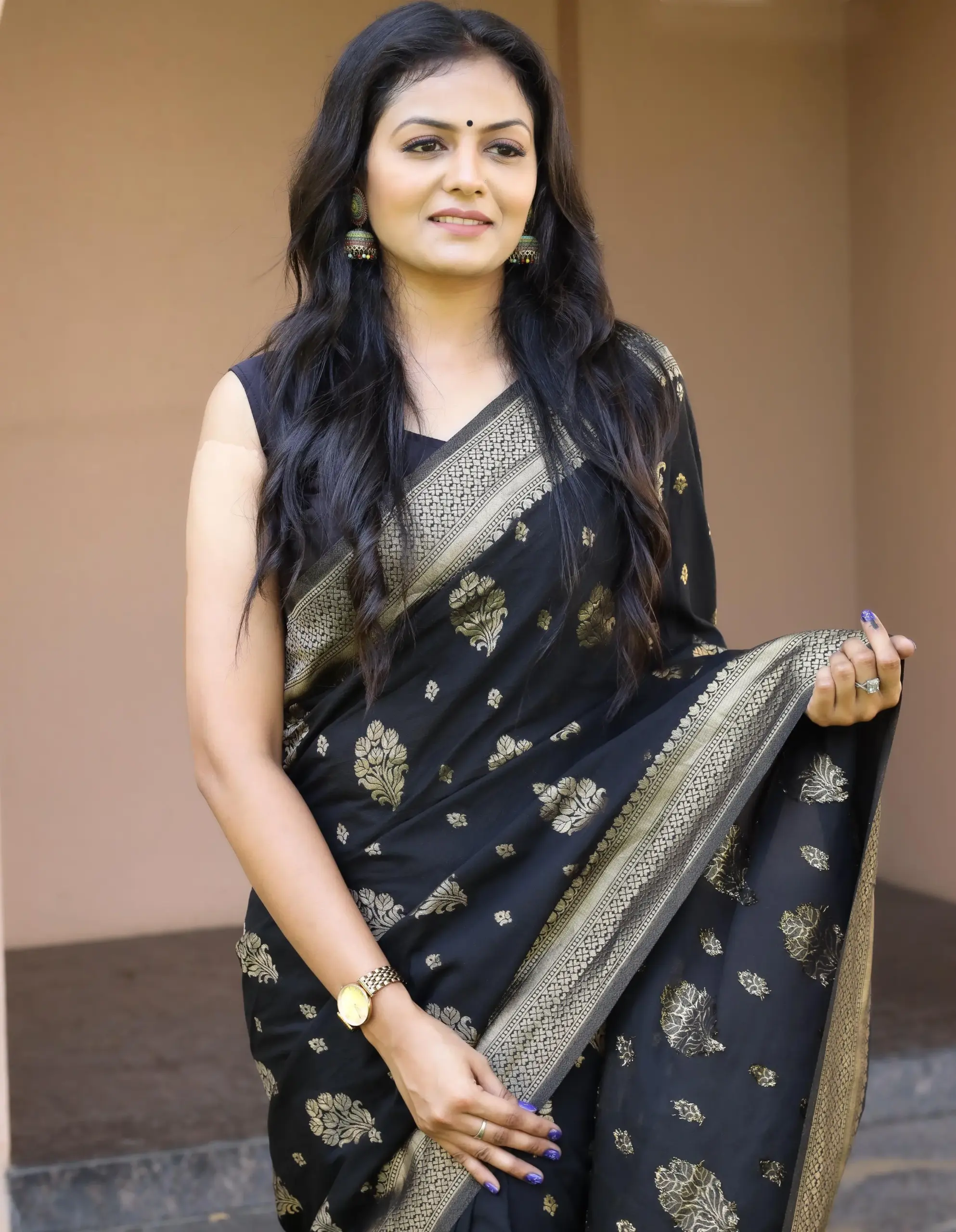 This magnificent Black Soft Lichi Silk Jacquard Work Saree is the epitome of traditional grandeur and luxurious texture. Lichi Silk is highly prized for its rich feel, beautiful drape, and subtle sheen. Featuring intricate Jacquard weaving and a dramatic rich pallu, this ensemble is perfect for weddings, festivals, and all grand celebratory occasions.