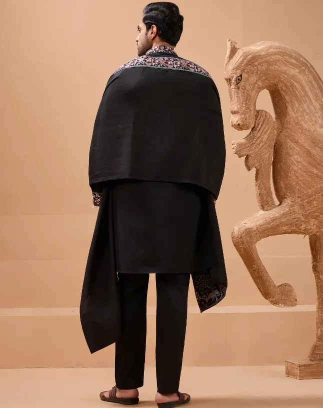 Kurta (Top): Crafted from Viscose Silk, a fabric known for its deep, lustrous black finish and soft drape.