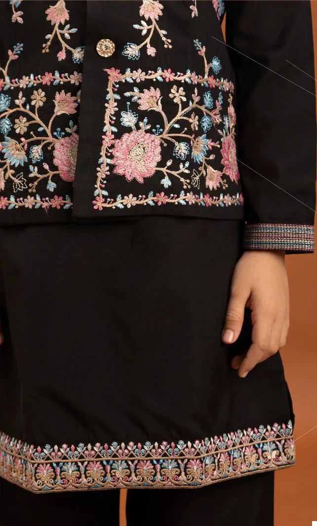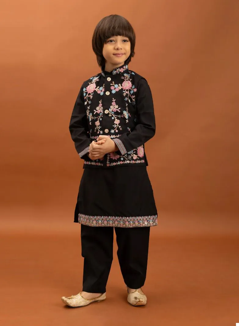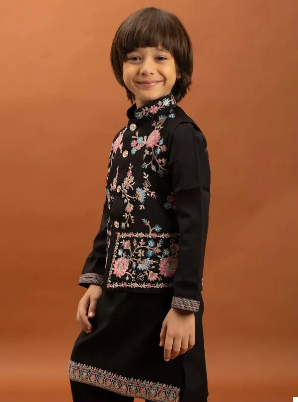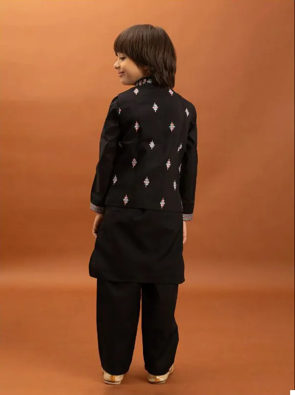 Dress your young one in this vibrant Black Viscose Silk Koti Kurta with Pant set, perfect for adding a touch of festive cheer to any occasion. This comfortable yet stylish ensemble ensures your child shines at every event.