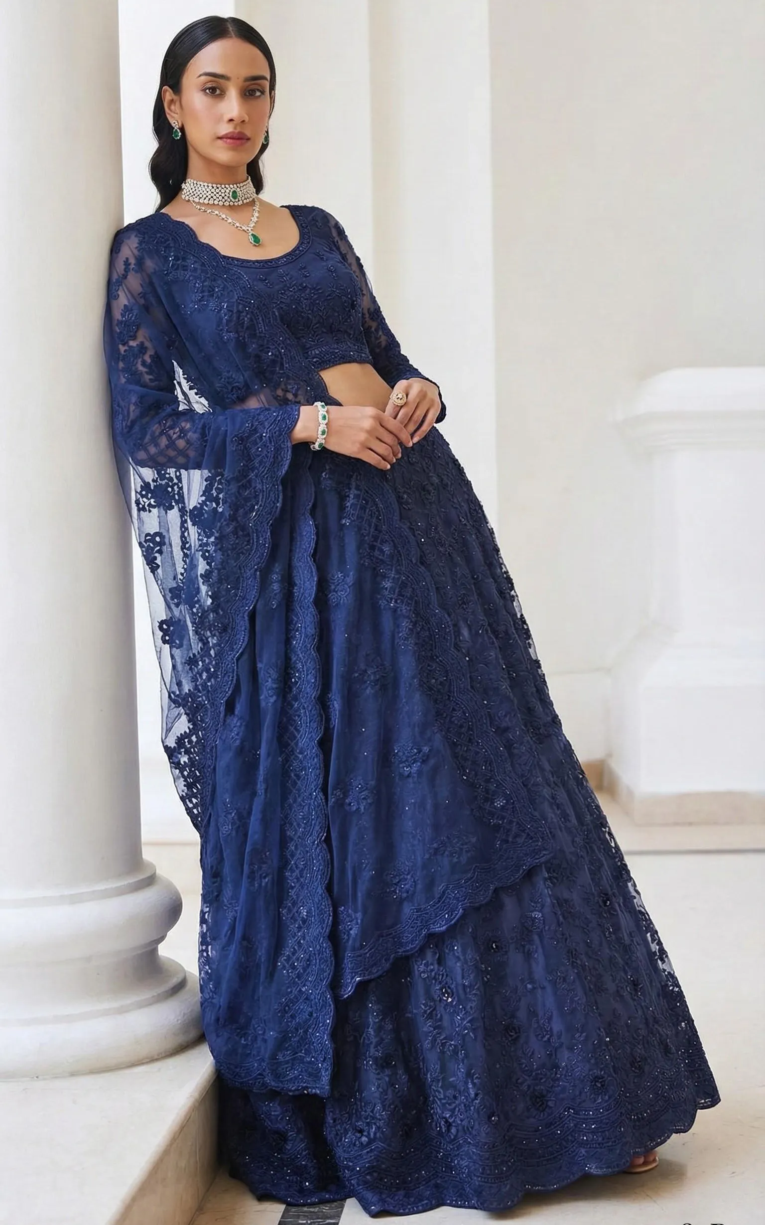 The Dupatta: Crafted from matching butterfly net with a Heavy Embroidered Border and scattered sequence work or “booti” designs throughout.