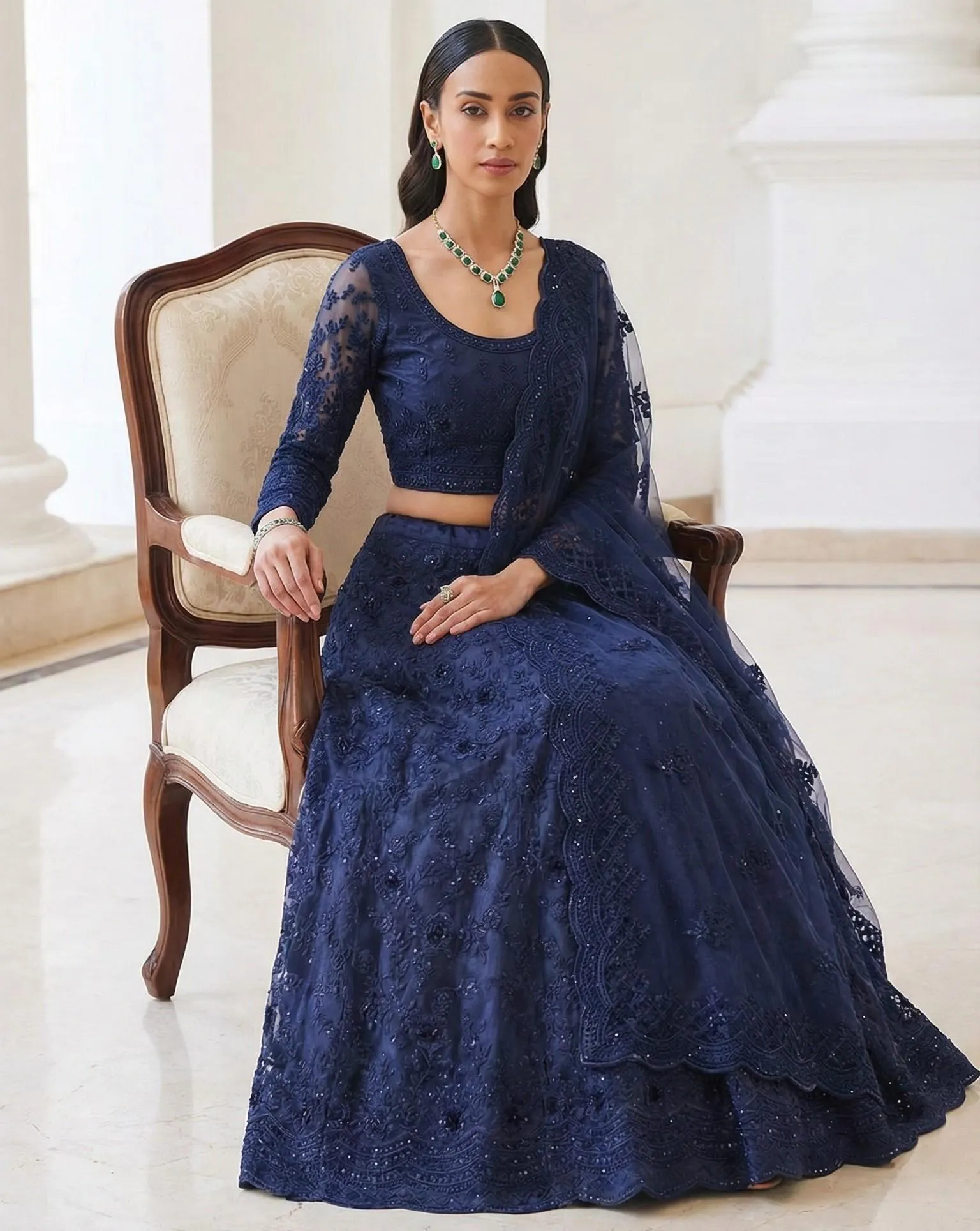 The Lehenga: Features intricate Thread, Zari, and Sequence Embroidery. Many designer versions also include Stone work and a “Big Cancan” with canvas to provide that signature royal “stand-out” volume.