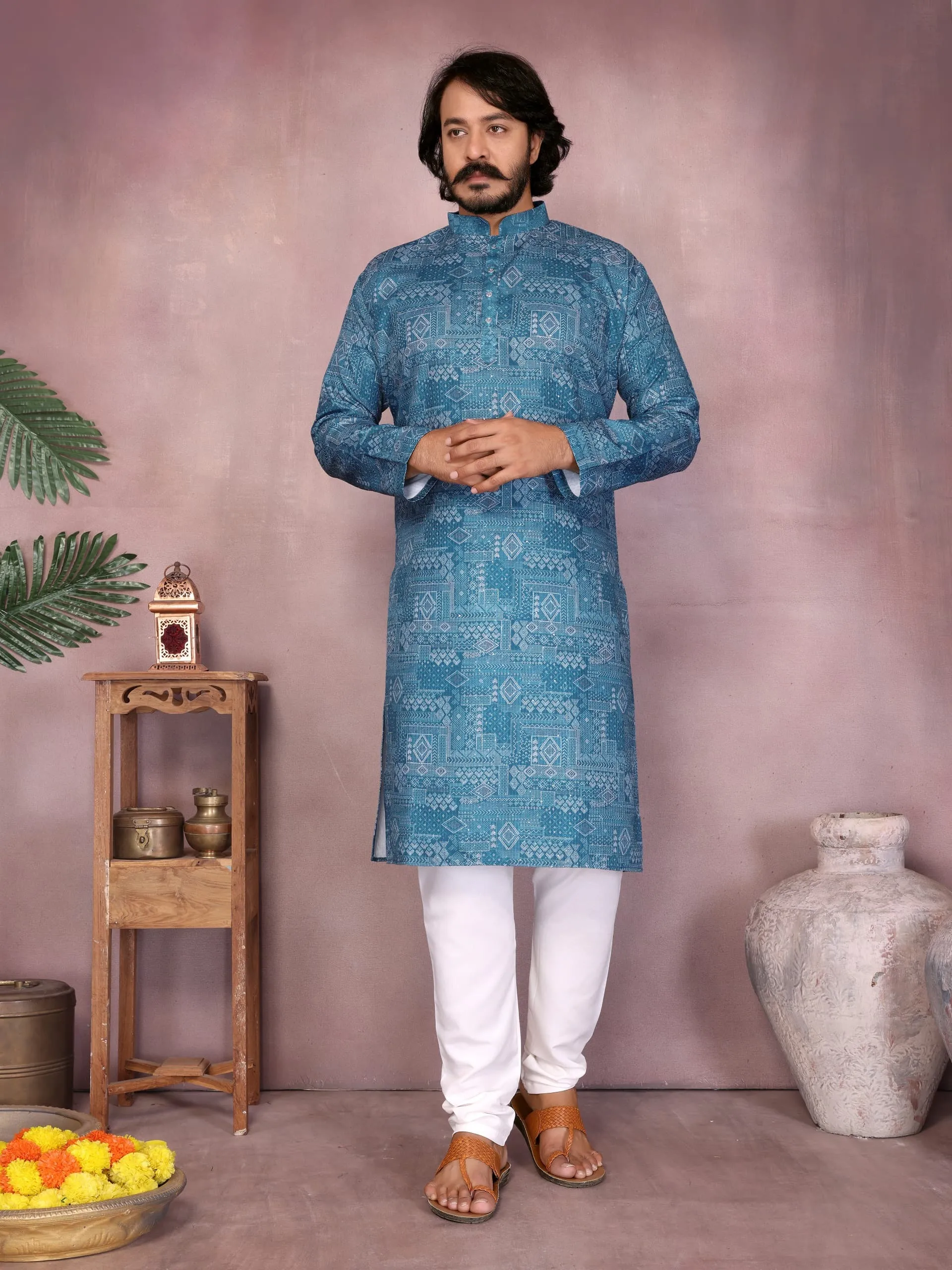 Blue Heavy Cotton Stitched Printed Men’s Kurta Pyjama