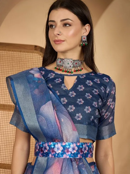Blue Linen Cotton Abstract Printed Saree