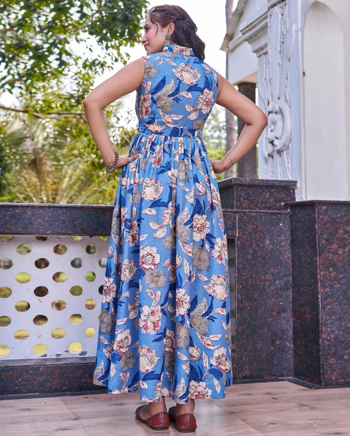 Blue Poly Cotton Floral Printed Party Wear Gown