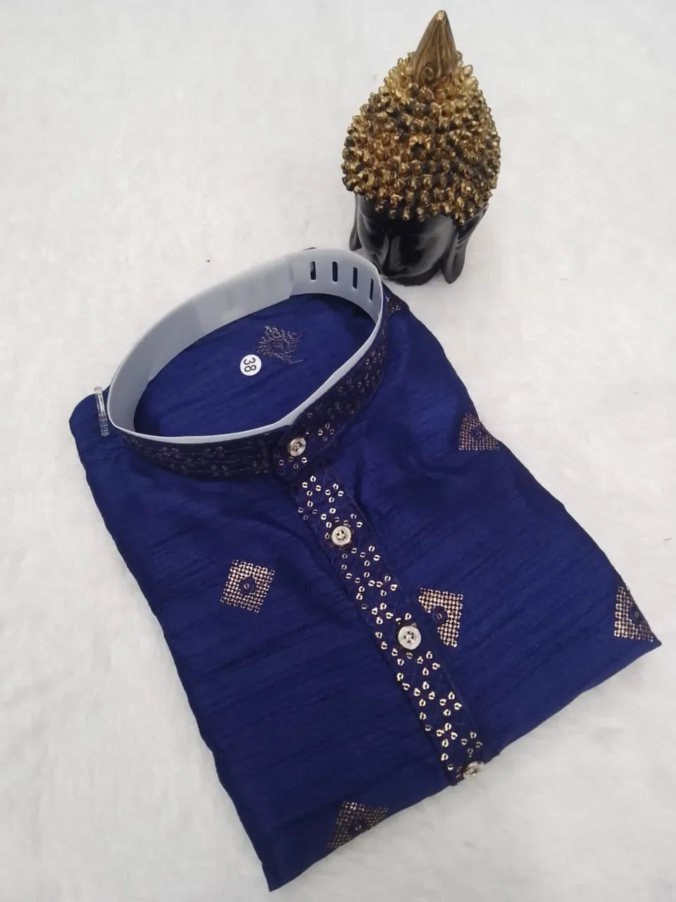 Kurta Fabric and Color: The Kurta is crafted from Silk, a premium fabric known for its natural sheen and rich drape. The color is a vibrant Blue, an auspicious and intensely festive hue.