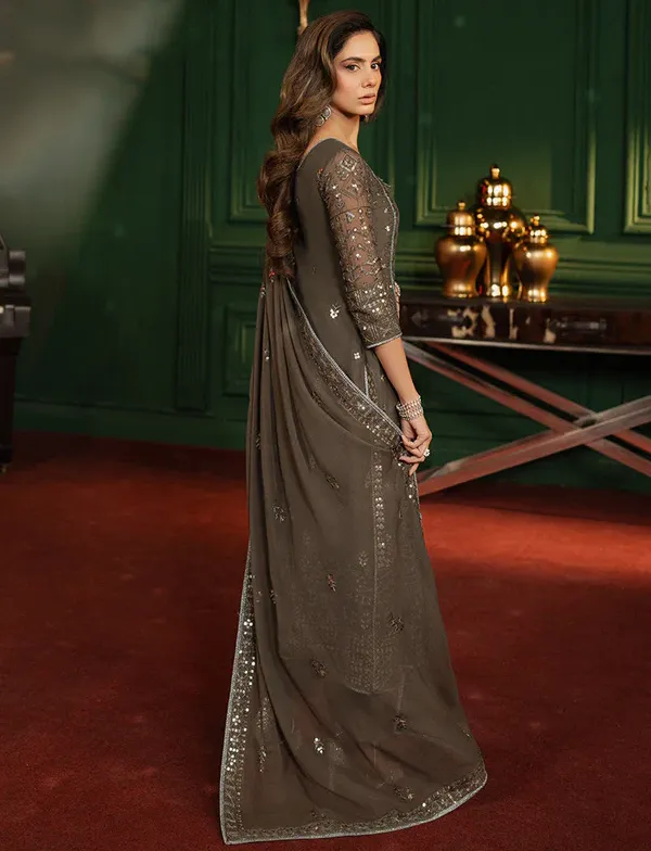 Brown Heavy Faux Georgette Khatli Work Pakistani Suit
