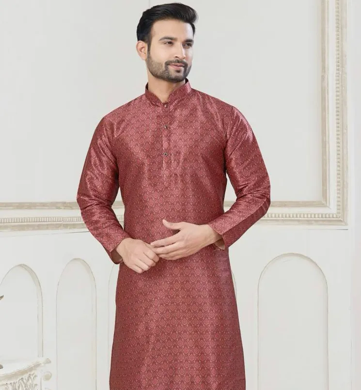 Kurta Fabric and Color: The Kurta is crafted from Silk, a premium fabric known for its natural sheen and rich drape. The fabric features Jacquard Work (patterns woven directly into the fabric) in a festive Brownย hue. This weaving technique provides inherent texture, depth, and formality.