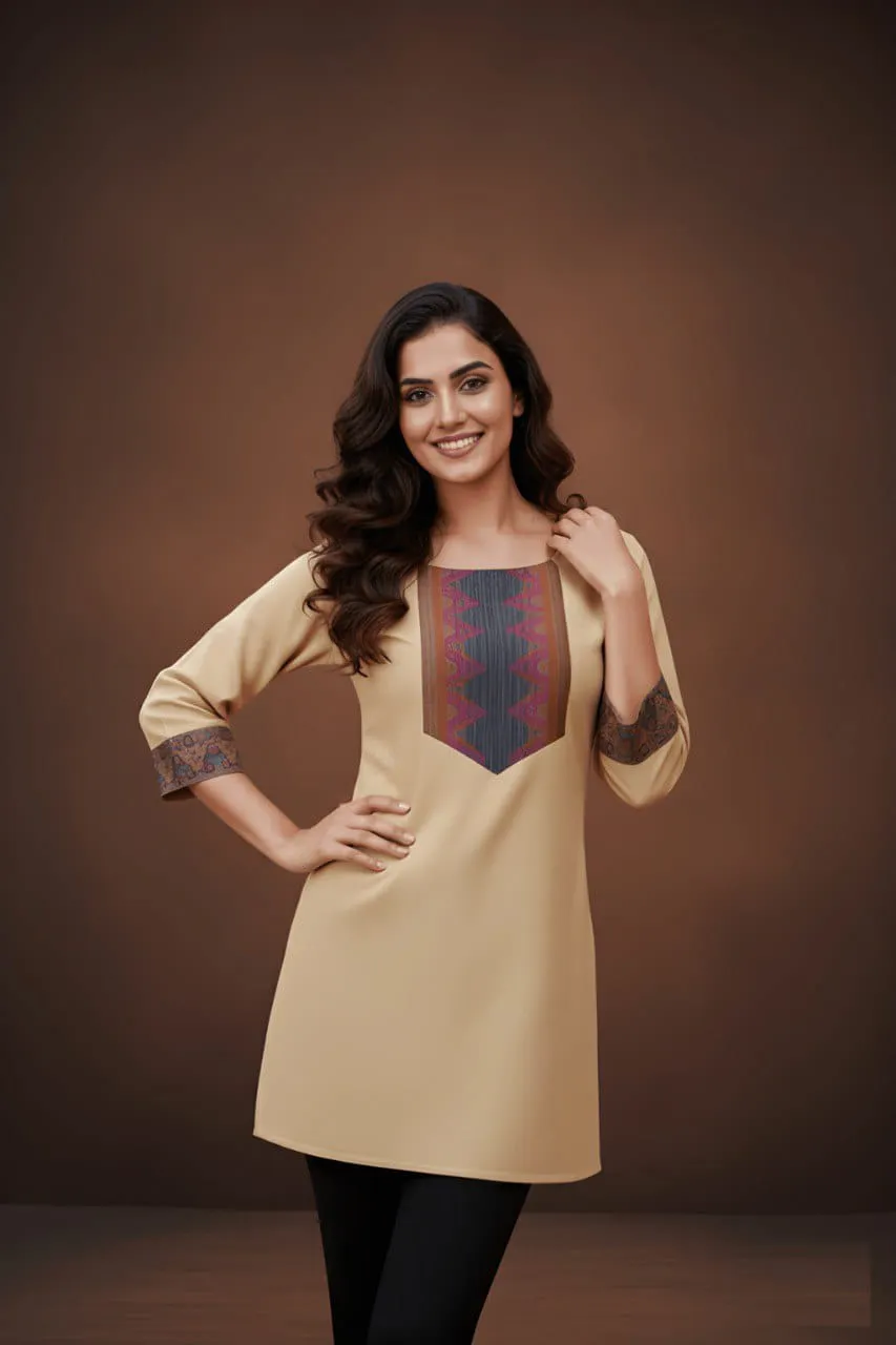 The round neck is enhanced with subtle jacquard work, adding a refined and classy touch without being overpowering. The 3/4 sleeves provide comfort and practicality, making it suitable for daily wear, office use, casual outings, or light festive moments. Its short kurti length ensures ease of movement and pairs perfectly with leggings, pants, palazzos, or jeans.
