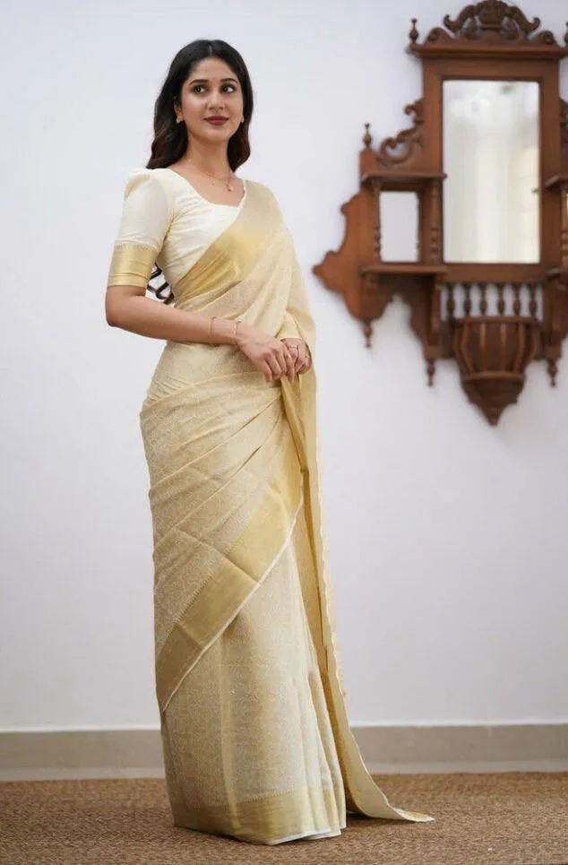 This magnificent Cream Lichi Silk Weaving Work Saree is the epitome of traditional craftsmanship and luxurious texture. Lichi Silk is highly prized for its rich feel, beautiful drape, and subtle sheen. Paired with a structured Banglori silk blouse, this ensemble is perfect for weddings, festivals, and all grand celebratory occasions.