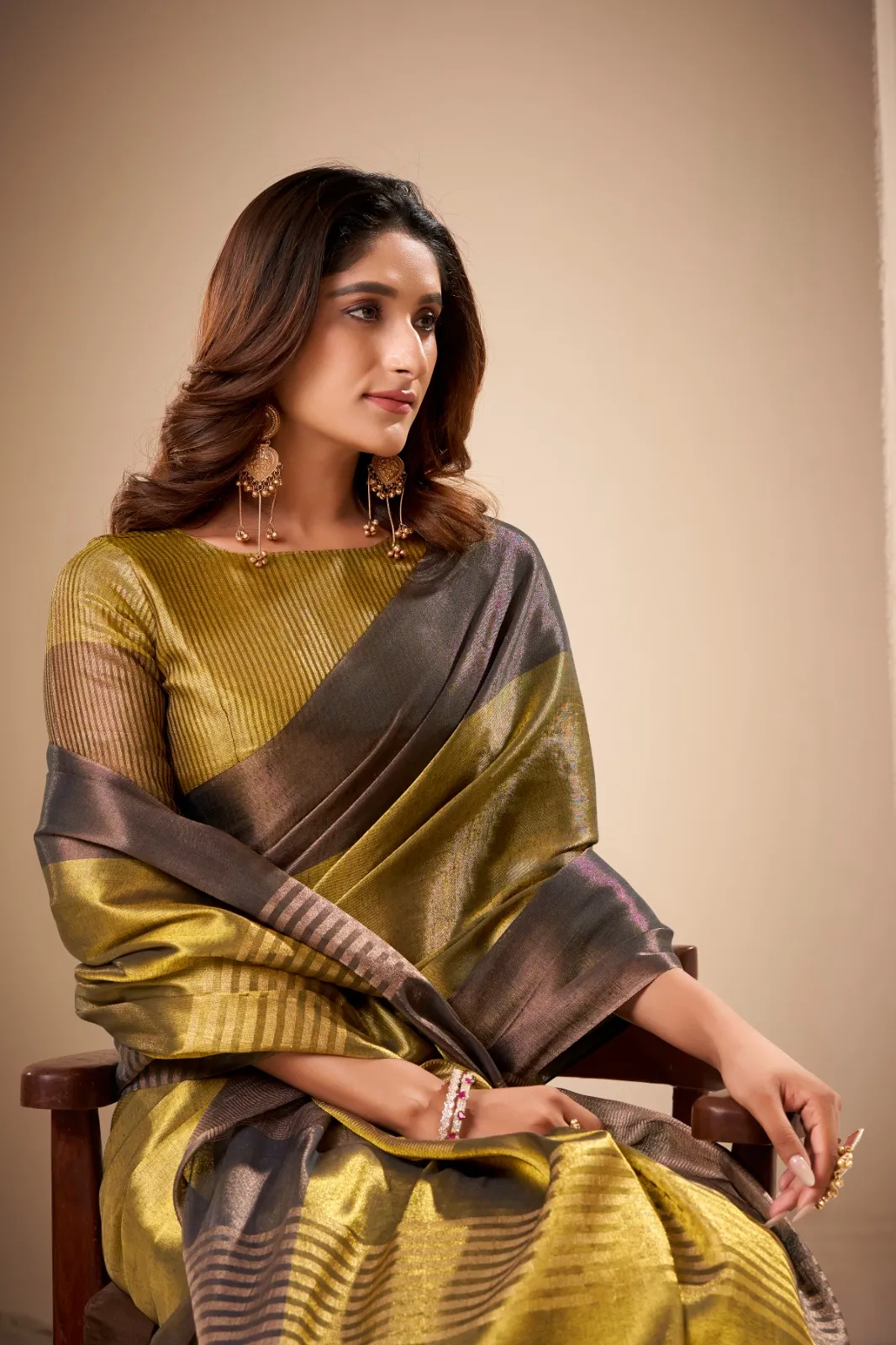 The Fabric: It is made of Tissue Soft Silk. “Tissue” means the fabric is woven with very thin silk and gold or silver threads. This makes the saree look very metallic and shiny like a gift wrapper.