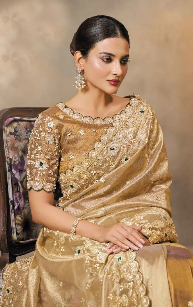 Golden Cora Zari Tissue Silk Zardoshi Work Designer Saree