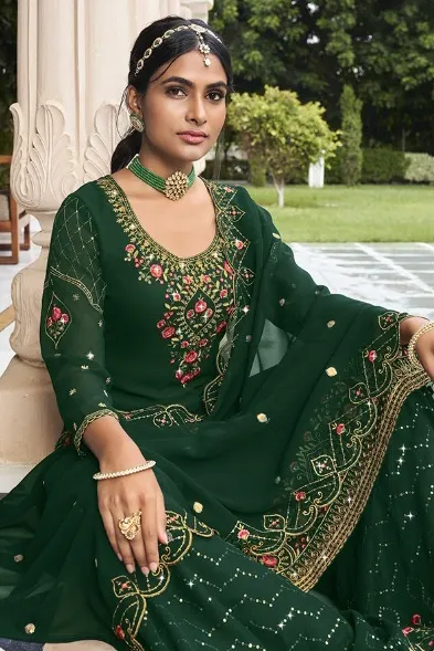 Top (Kameez): Crafted from Green Georgette featuring heavy, all-over embroidery. This often includes threadwork, sequins, or coding dori work to create a multi-dimensional sparkle.