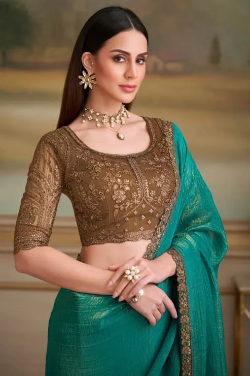 Drape yourself in the fluid elegance of this beautiful Green Gold Georgette Saree, perfectly balanced by a striking Heavy Tussar Silk Blouse. This outfit harmonizes the soft flow of georgette with the rustic richness of Tussar silk, making it ideal for formal celebrations.