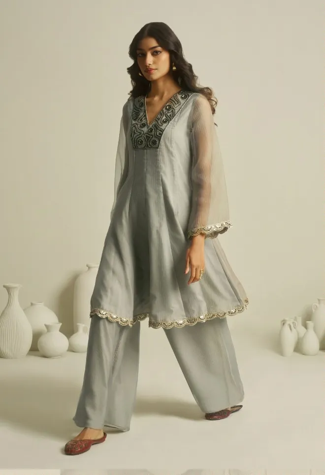 Fabric: The kurti is crafted from Pure Tissue Silk, a material famous for its crisp, translucent texture and natural golden-silver sheen. It is incredibly lightweight but holds its shape well, providing a regal, structured look.