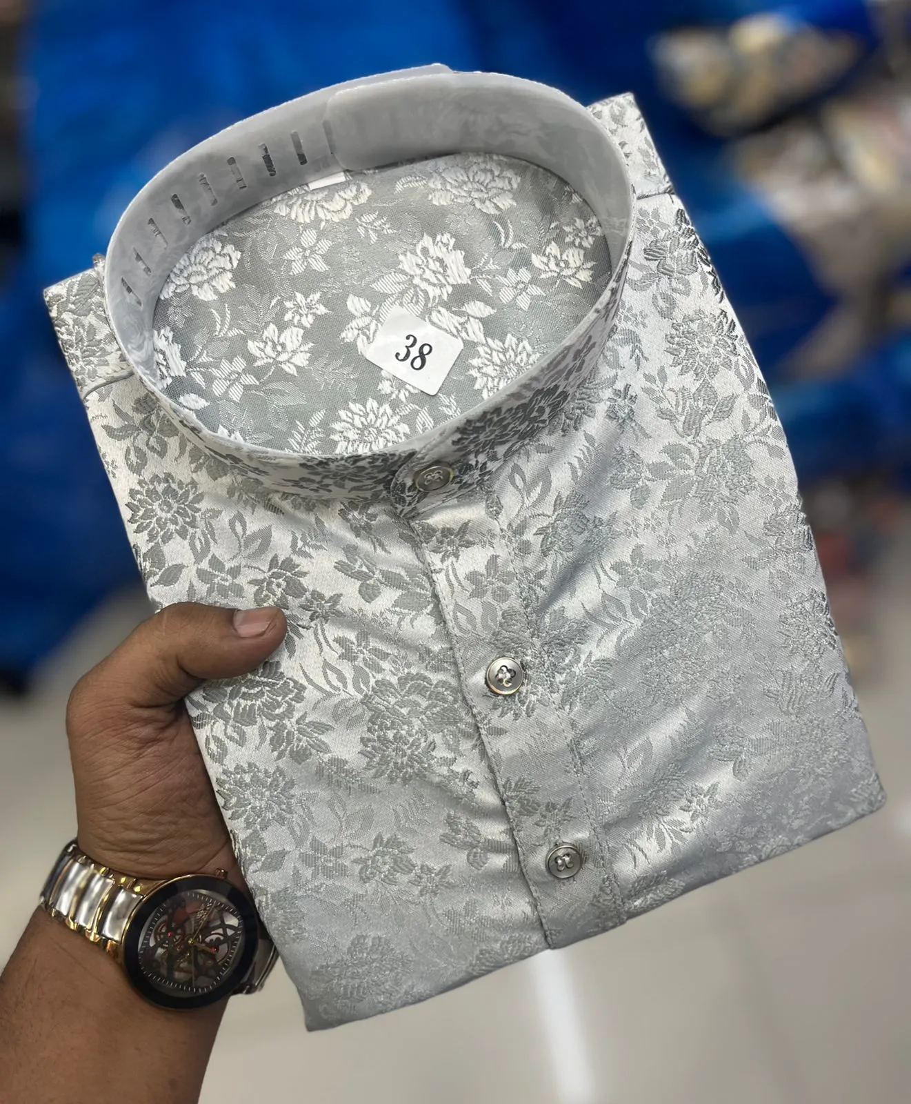 Kurta Fabric and Color: The Kurta is crafted from Silk, a premium fabric known for its natural sheen and elegant drape. The fabric features Jacquard Work (patterns woven directly into the fabric) in a calming Greyย hue. This weaving technique provides inherent texture, depth, and formality.