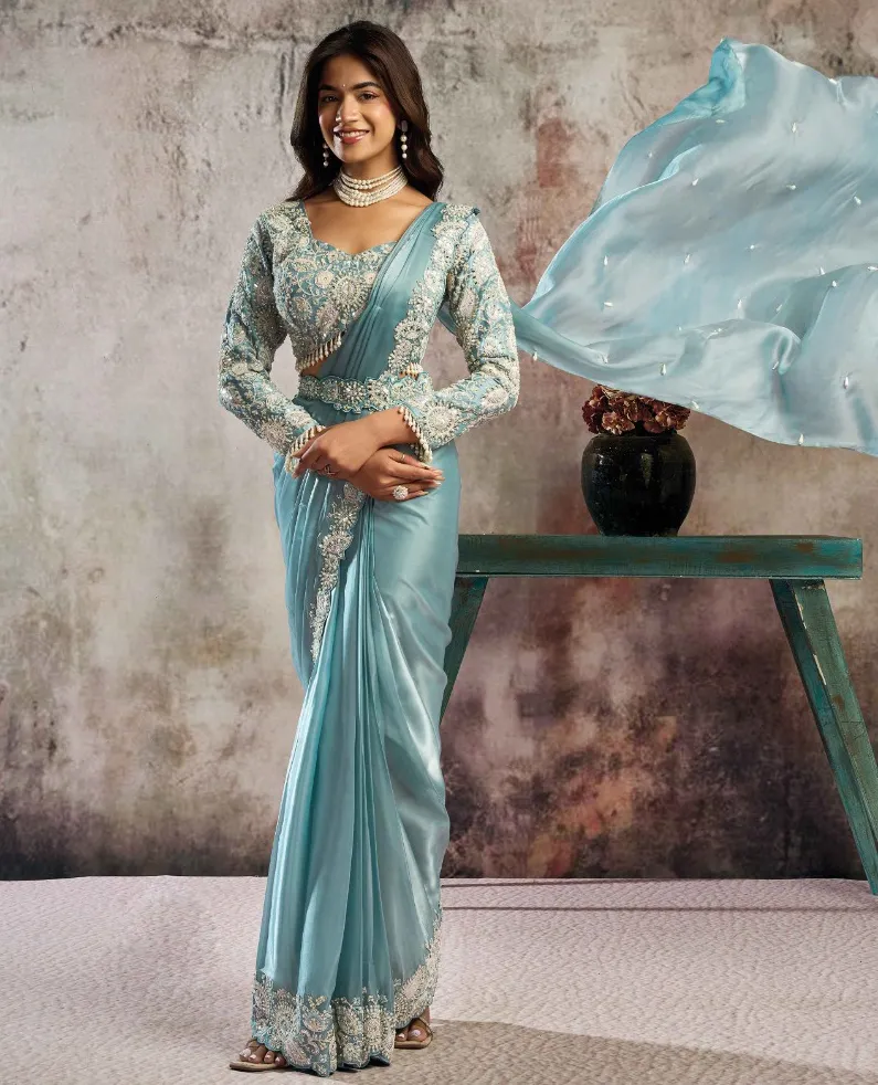 Light Blue Lustrous Satin Mirror Hand Work Readymade Saree