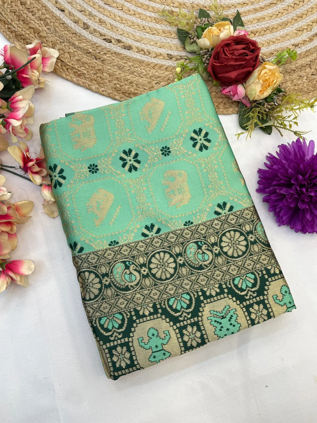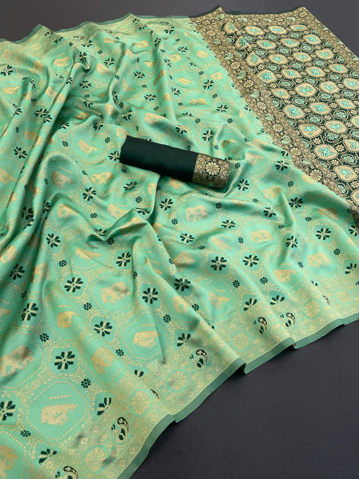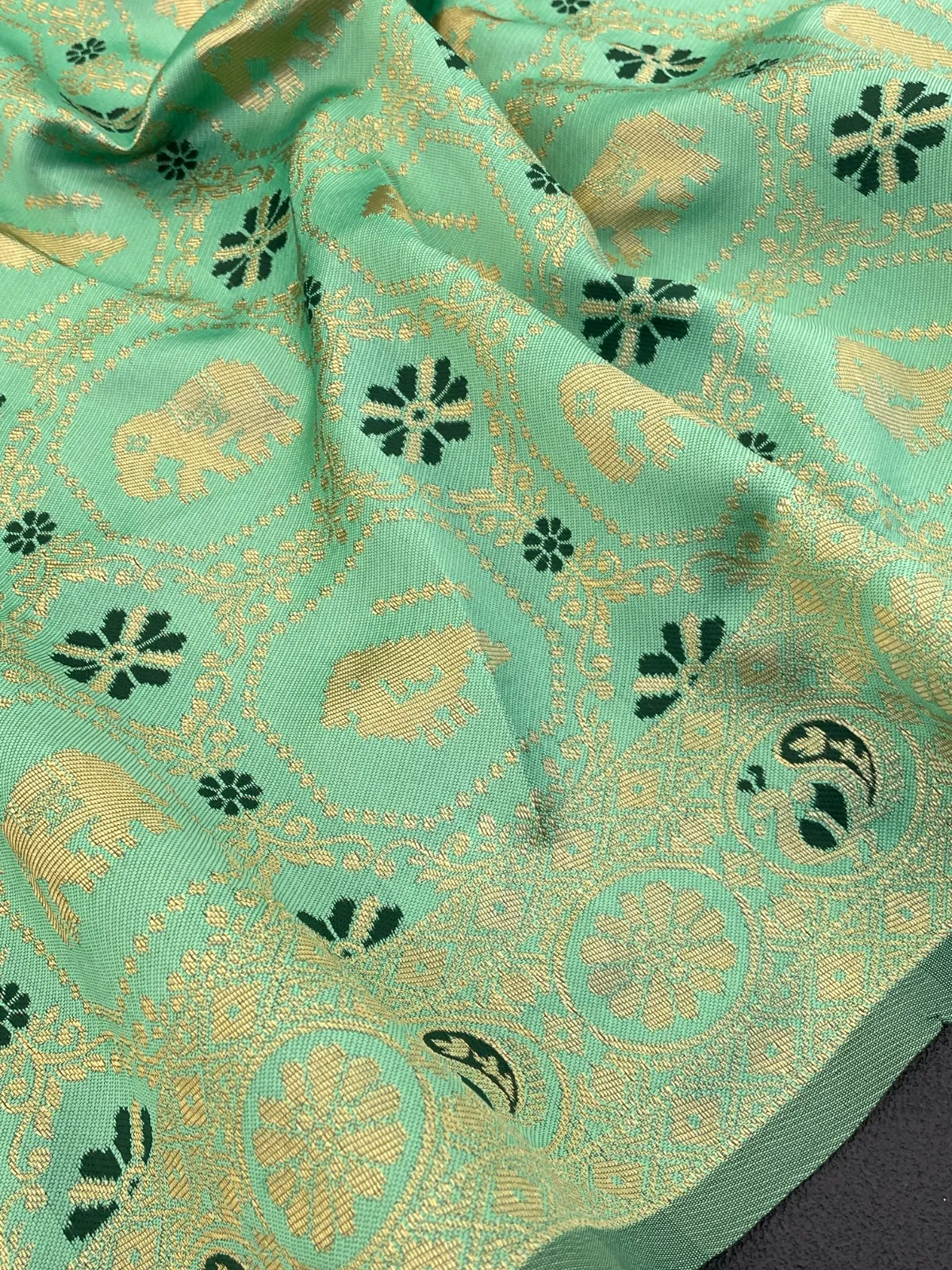 This magnificent Light Green Banarasi Silk Weaving Work Saree is the epitome of heritage craftsmanship and timeless elegance. Banarasi silk is highly prized for its traditional weaving artistry. Combined with the rich texture of the silk and a complementing brocade blouse, this ensemble is perfect for weddings, traditional ceremonies, and grand celebratory occasions.