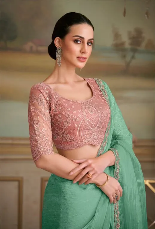 Exude graceful elegance with this delicate Light Green Tissue Crush Georgette Saree, perfectly balanced by a striking Tussar Silk Heavy Blouse. This unique combination blends the airy texture and soft luminosity of the saree with the traditional, rich structure of the Tussar silk.