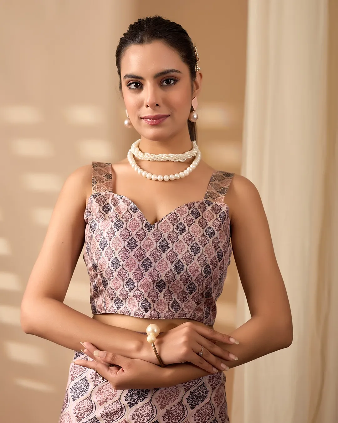 Blouse: Paired with a stunning Contrast Satin Silk Blouse piece. The high-gloss sheen of the satin silk provides a luxurious, dramatic contrast to the subtle print and soft texture of the Lichi Silk saree.