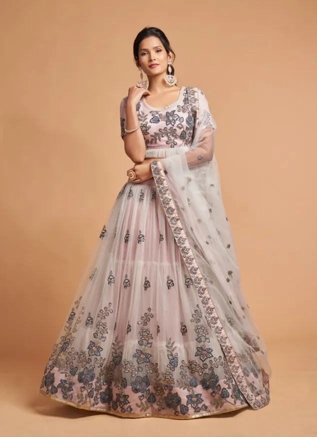 Light Pink Soft Net Sequins Embroidered Lehenga