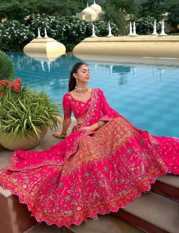Color & Fabric: The lehenga features a vibrant Magenta design. The Lehenga Fabric is Fancy Silk, known for its beautiful sheen and structured flow, ensuring a regal look.