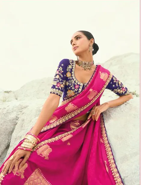The vibrant magenta pink color makes this saree perfect for parties, weddings, receptions, festive celebrations, and special occasions. Style it with statement jewelry and heels to complete a sophisticated ethnic look.