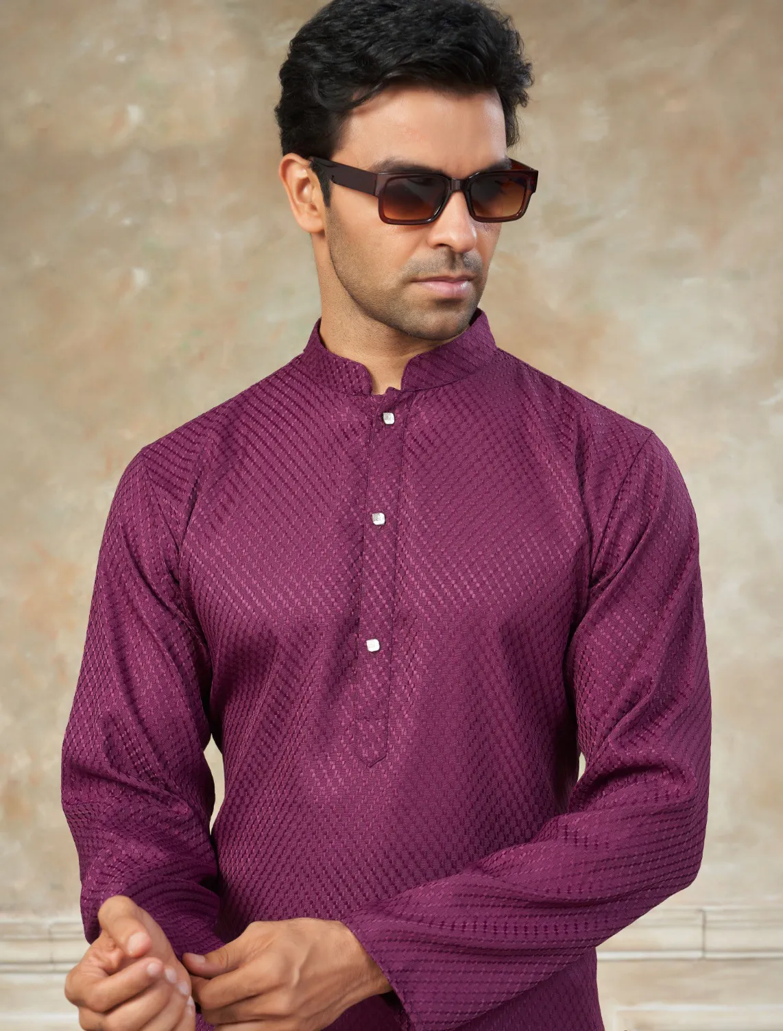 Add elegance to your ethnic collection with this Magenta Pink Rayon Cotton Schiffli Work Men’s Kurta Pyjama. Designed for comfort and style, this outfit is crafted from premium rayon cotton fabric, making it lightweight, breathable, and perfect for long festive occasions.