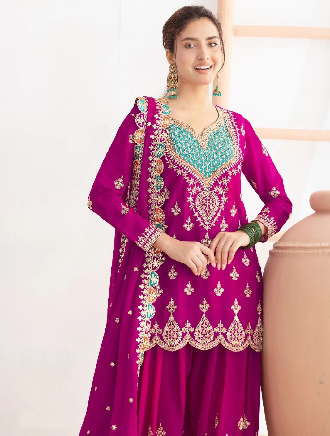 Bottom (Palazzo): A matching Premium Chinon Embroidered Palazzo with complementary handwork detailing, offering a trendy and comfortable silhouette.