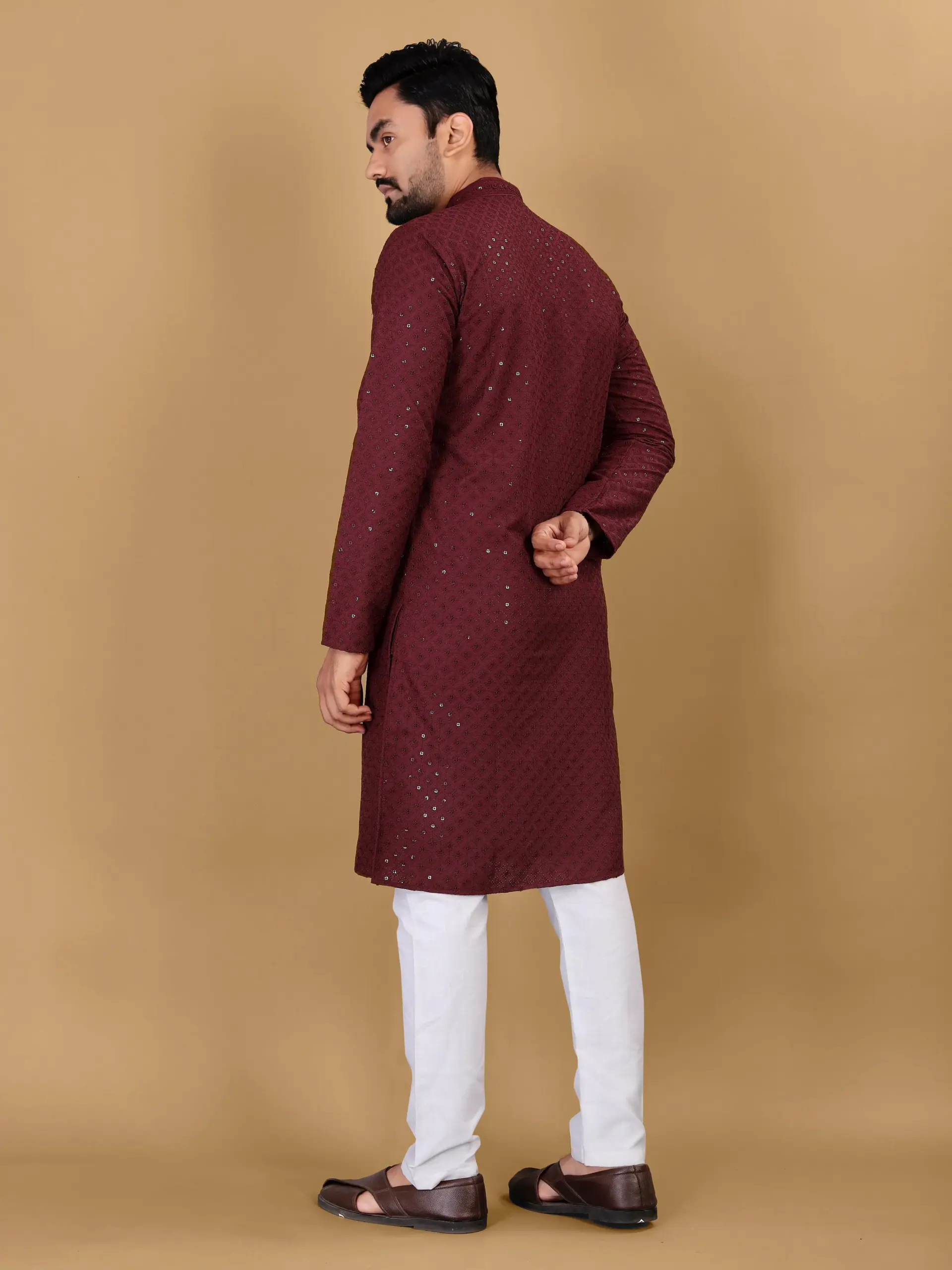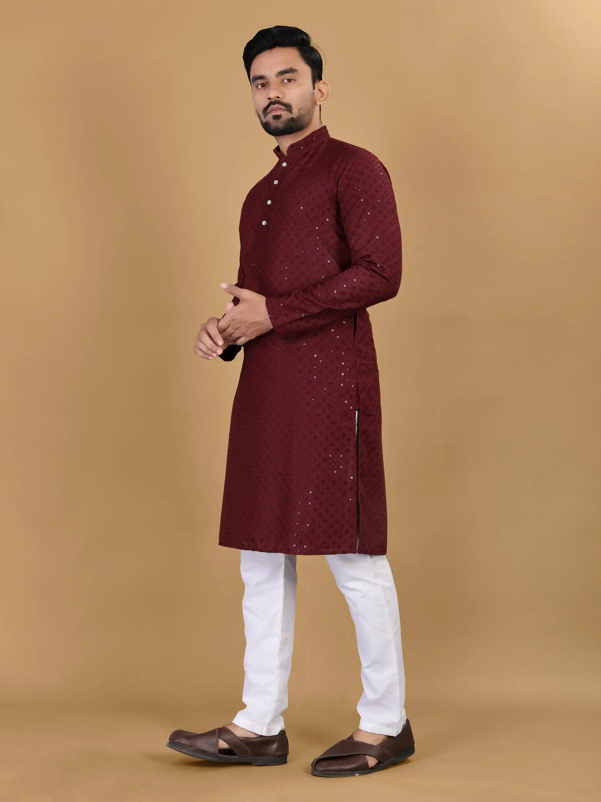 Maroon Cotton Rayon Sequins Work Mens Kurta Pyjama