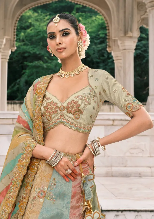 Color & Fabric: The lehenga features a vibrant combination of Mint Green, colors traditionally associated with happiness and festivity. The Lehenga Fabric is Fancy Silk, known for its beautiful sheen and structured flow, ensuring a regal look.