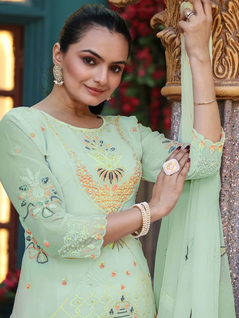 Color & Fabric: The soothing Mint Green color, combined with the soft, flowing Georgette fabric of the top and dupatta, creates an ethereal and feminine appeal.