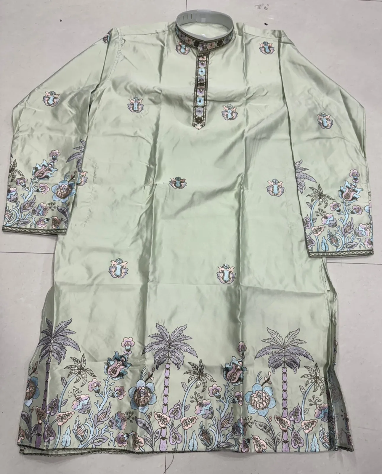 Workmanship: The Kurta features Embroidered detailing, which likely includes fine thread work around the collar, placket, or cuffs, adding a sophisticated, celebratory touch.