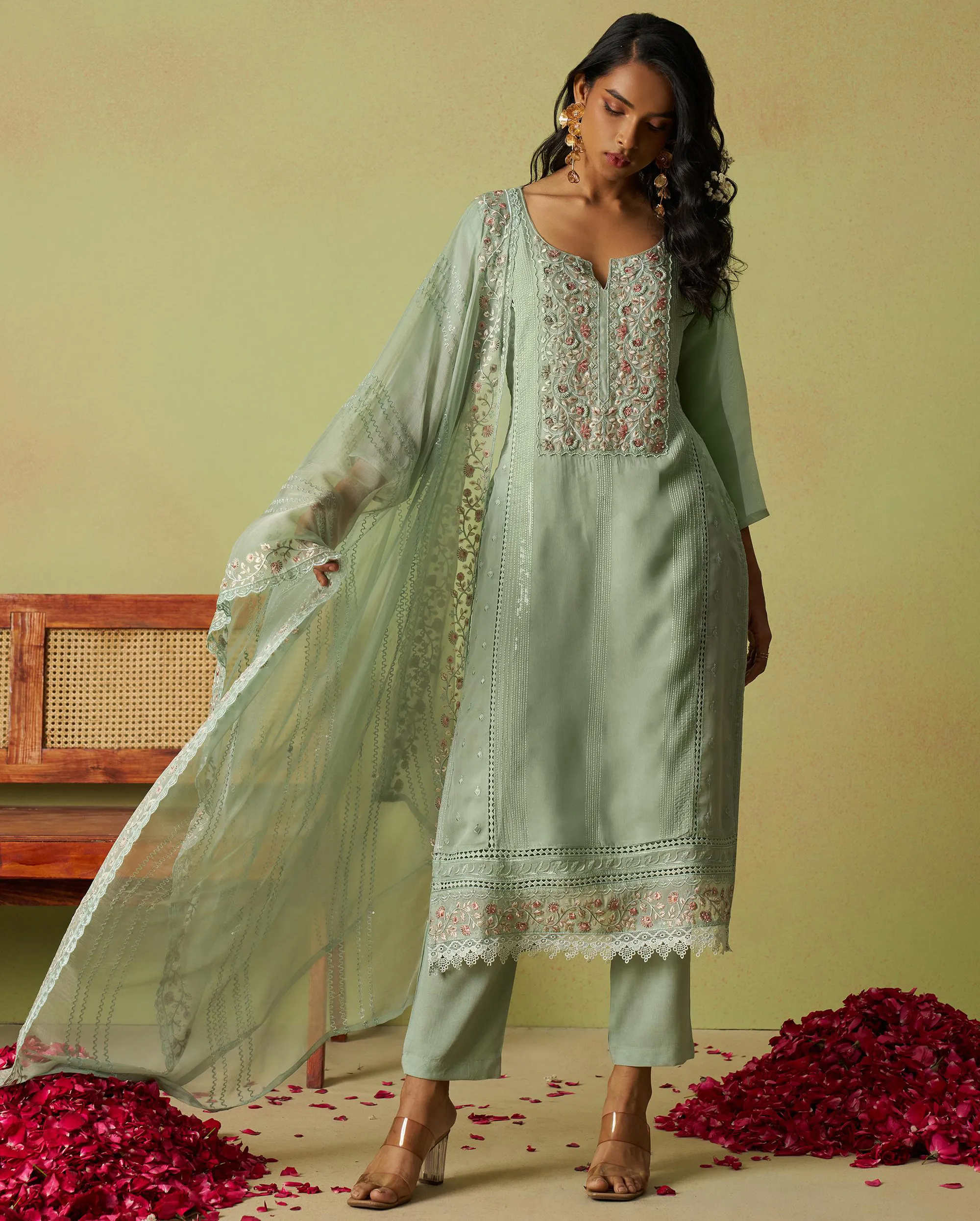 Mint Green Pure Organza Rich Embroidered Readymade Salwar Suit