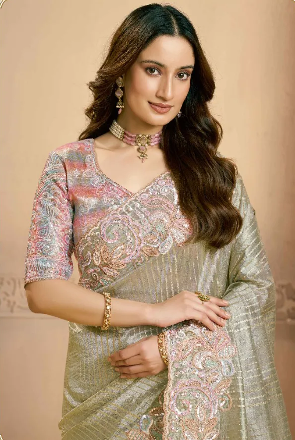 Mint Green Tissue Fabric: The saree is made from zari tissue, a lightweight fabric that has a beautiful metallic glow and a soft green tint.