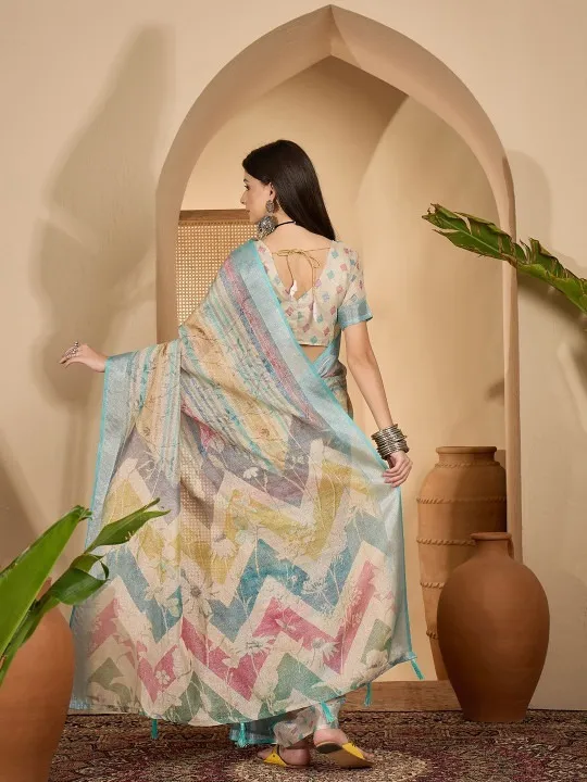 This exquisite Multicolor Linen Cotton Digital Printed Saree is the epitome of comfortable luxury fused with authentic Indian folk art. The breathable linen-cotton blend offers a beautiful, structured drape, which serves as a perfect canvas for the traditional Digital Print. Paired with a matching blouse, this ensemble is ideal for cultural events, artistic gatherings, and sophisticated daytime functions.