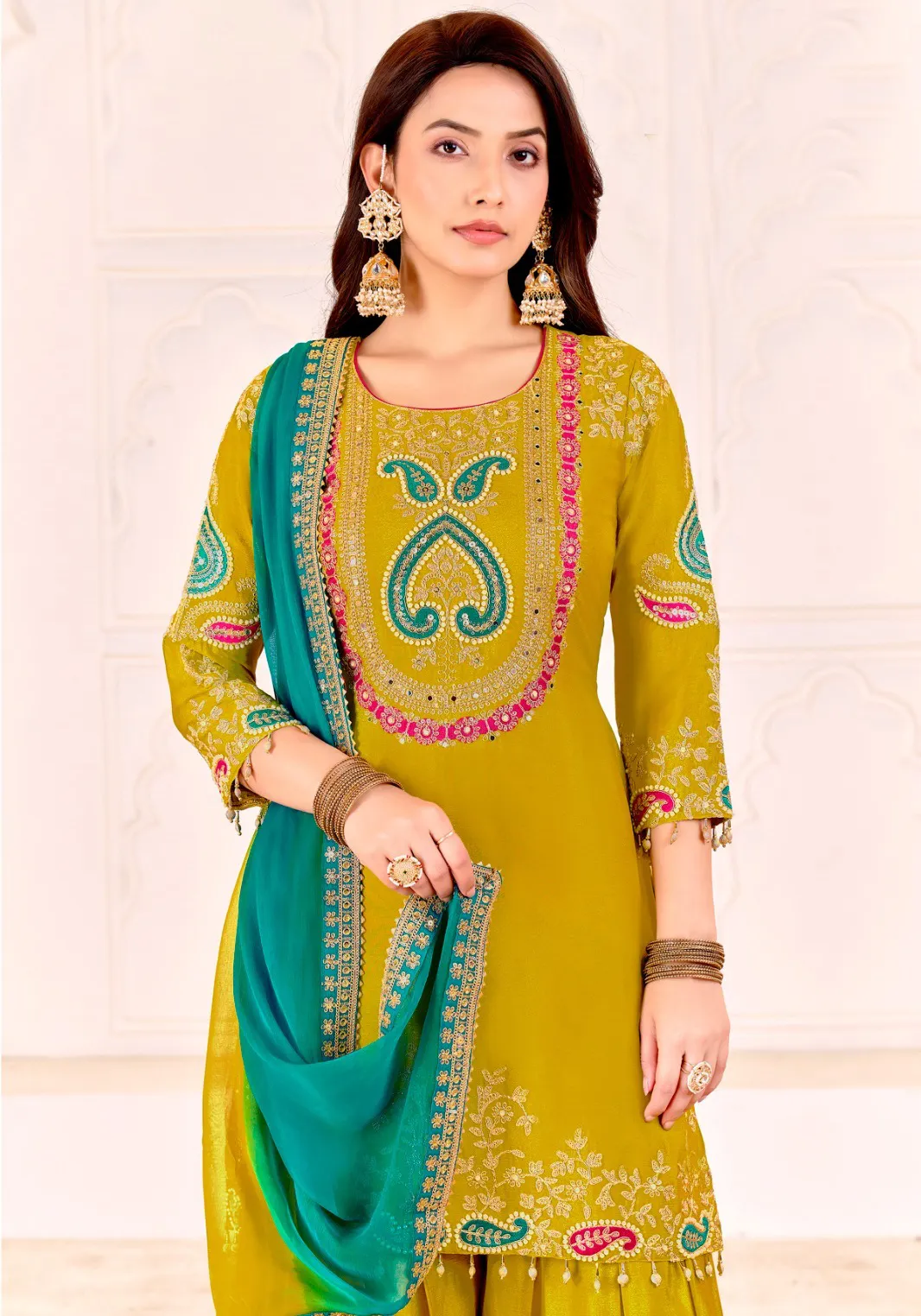 Mustard Premium Chinon Embroidered Traditional Sharara Suit