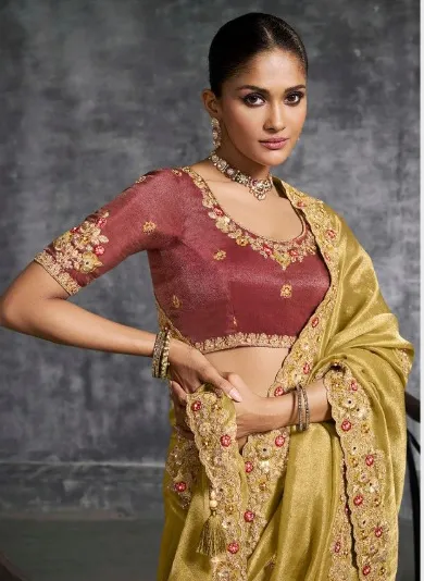 Exude sophistication and traditional charm with a contemporary flair in this exquisite Mustard Premium Tissue Saree. This designer piece is a masterpiece of craftsmanship, combining the luminosity of tissue fabric with dense, intricate handwork, creating a truly captivating ensemble perfect for grand celebrations.