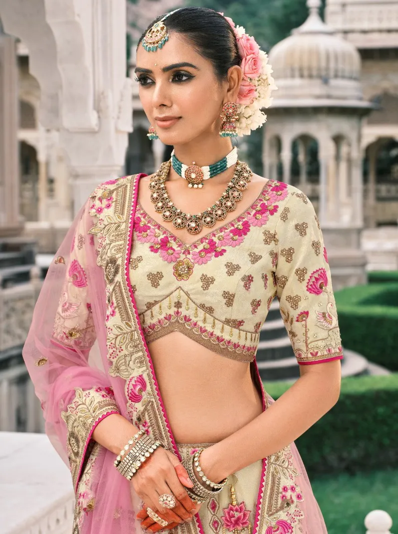 Color & Fabric: The lehenga features a vibrant combination of Off White, colors traditionally associated with happiness and festivity. The Lehenga Fabric is Fancy Silk, known for its beautiful sheen and structured flow, ensuring a regal look.