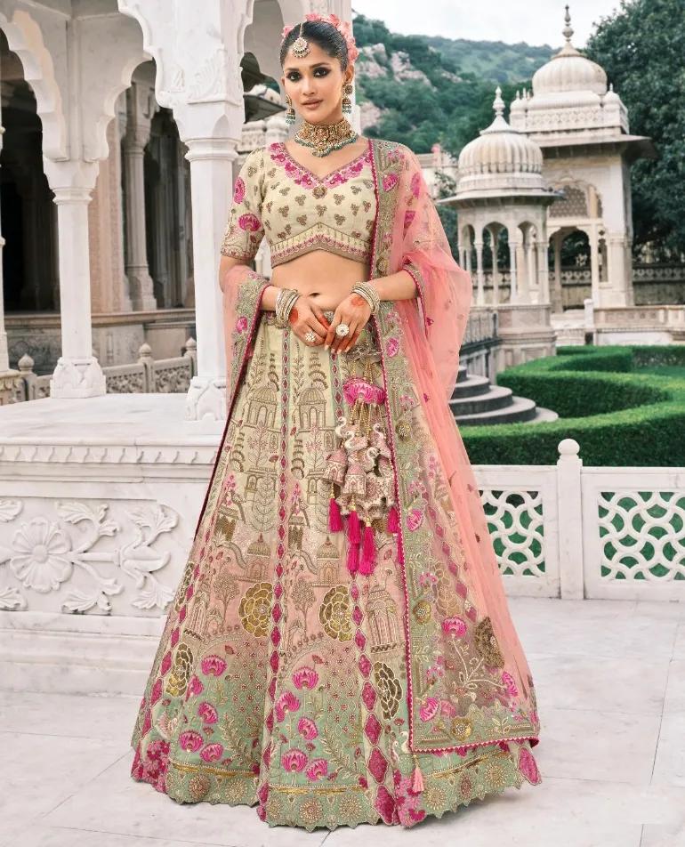 - Workmanship: Features Embroidery Work, coordinating beautifully with the lehenga. (Blouse is likely Unstitched as is typical for lehengas of this nature).