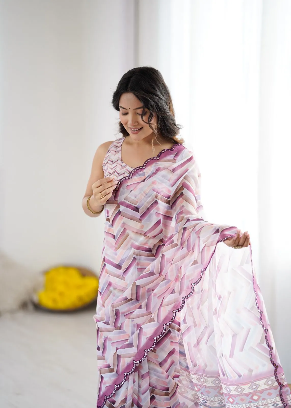 Saree Fabric and Design: The saree is made from lightweight and flowing Georgette, known for its excellent drape and movement.