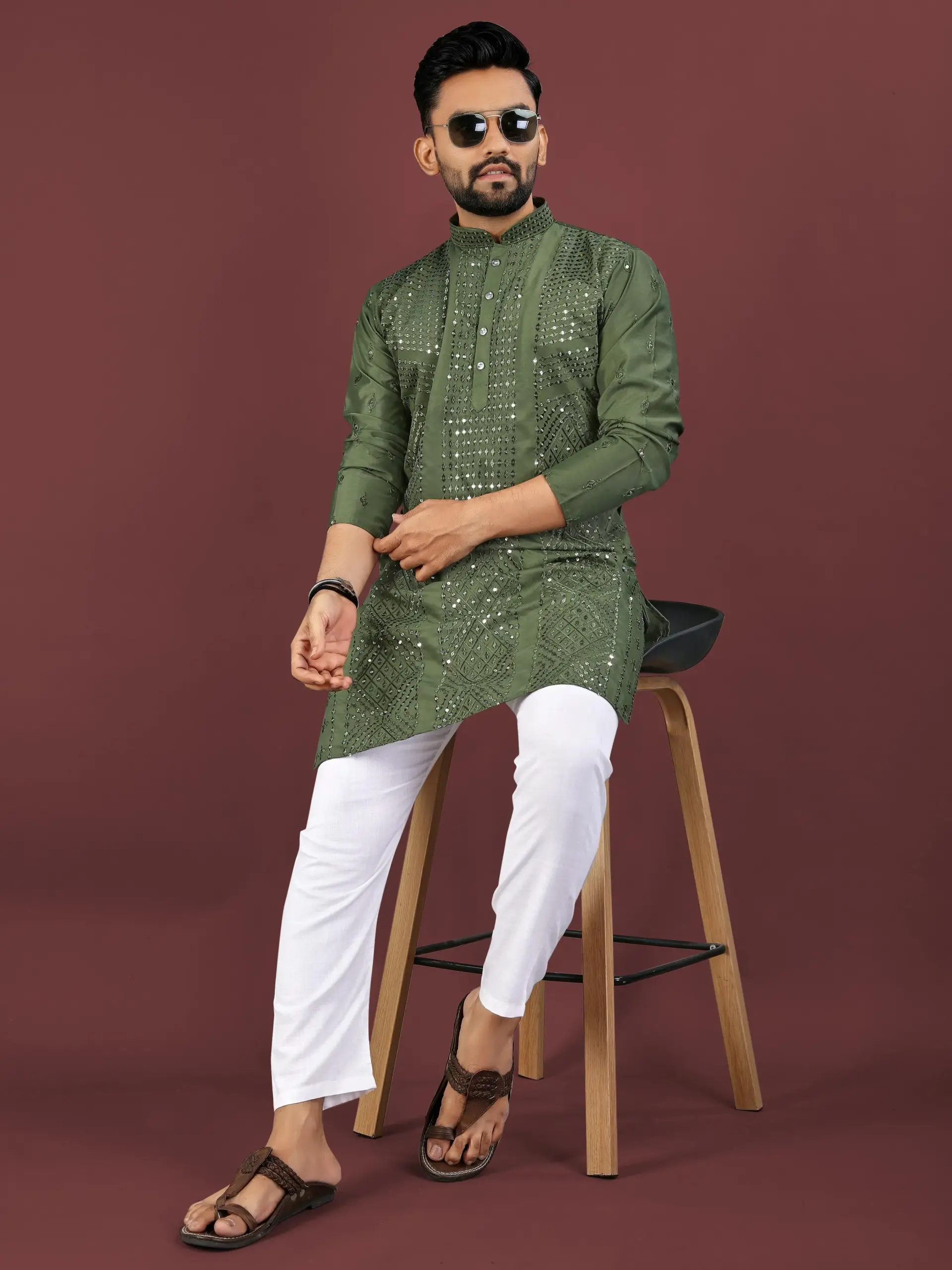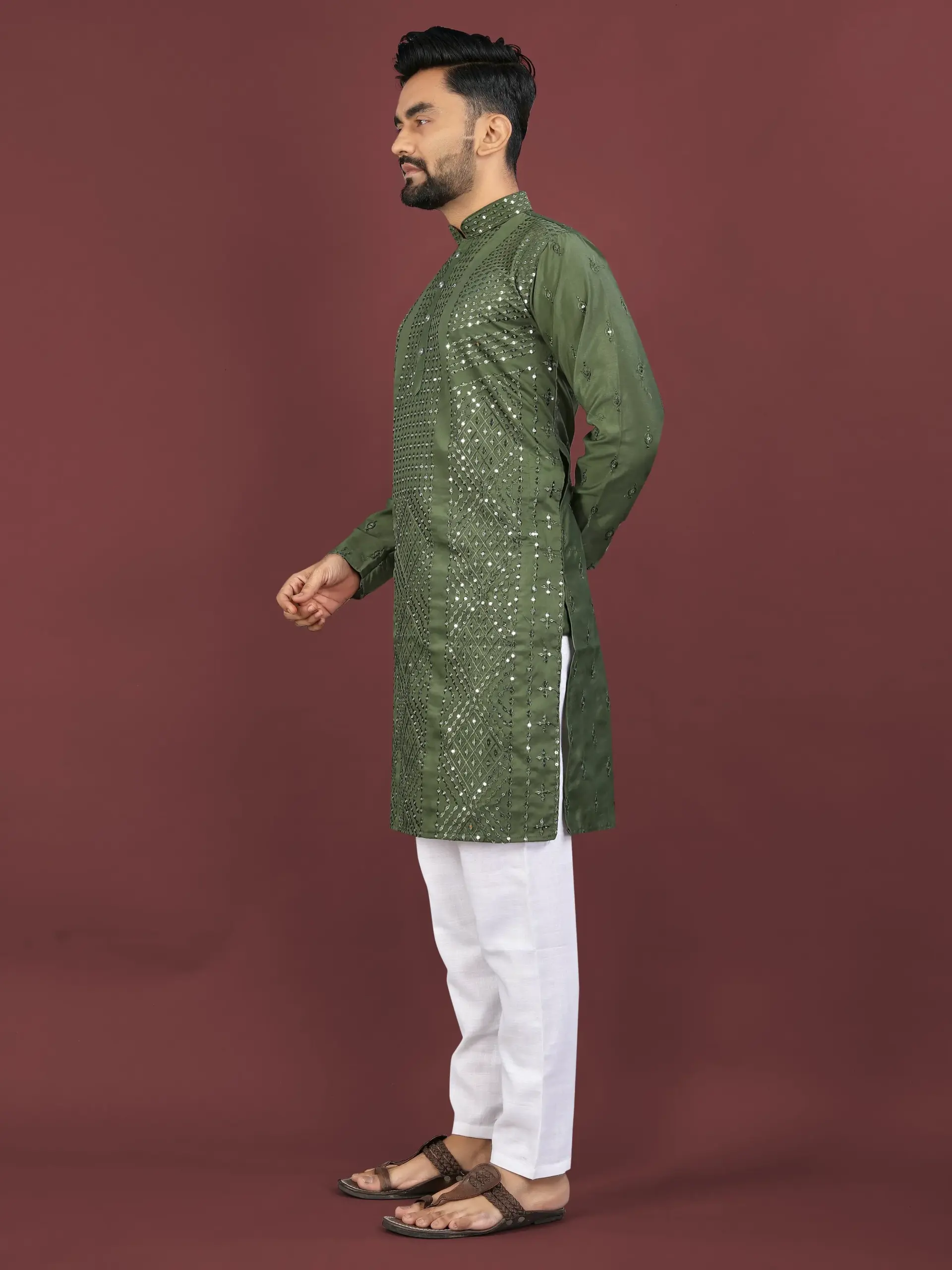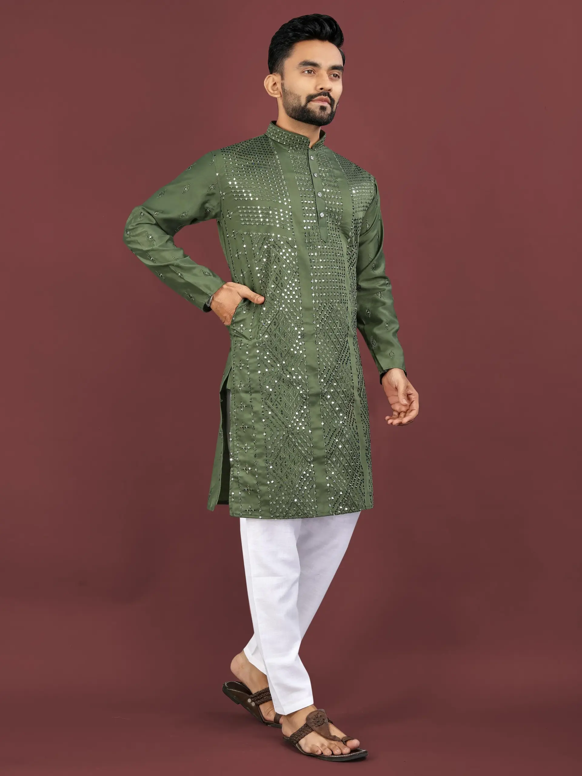 Presenting a stylish blend of traditional comfort and contemporary flair, this Olive Cotton Sequence Work Men’s Kurta Pyjama is an excellent choice for festive evenings and sophisticated semi-formal events. The grounded olive tone provides a unique canvas for the gentle shimmer of sequence work.