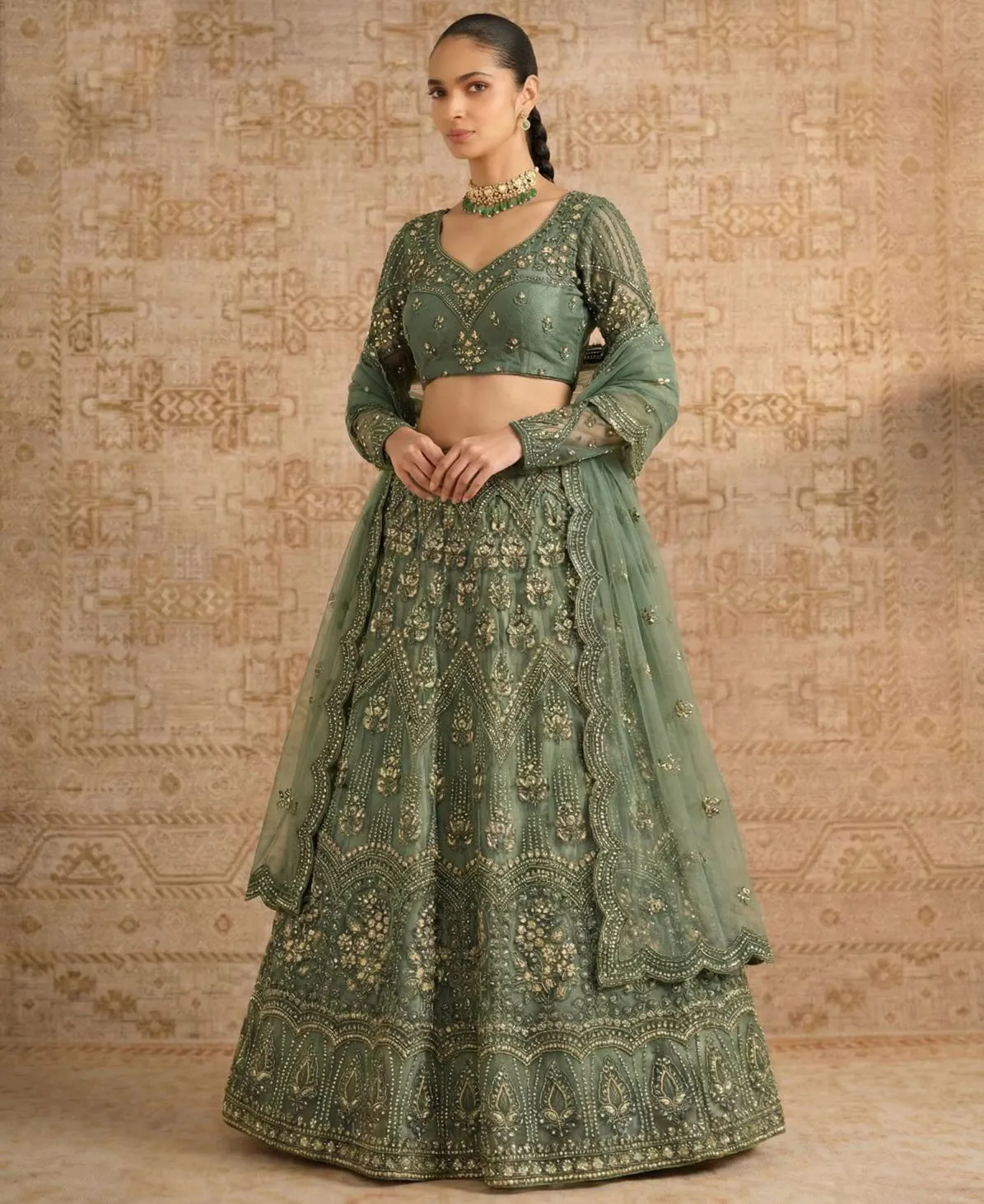 The matching embroidered dupatta with scalloped borders adds an extra layer of sophistication, completing the royal look. This unstitched lehenga set allows customization according to your preferred fit and design style.