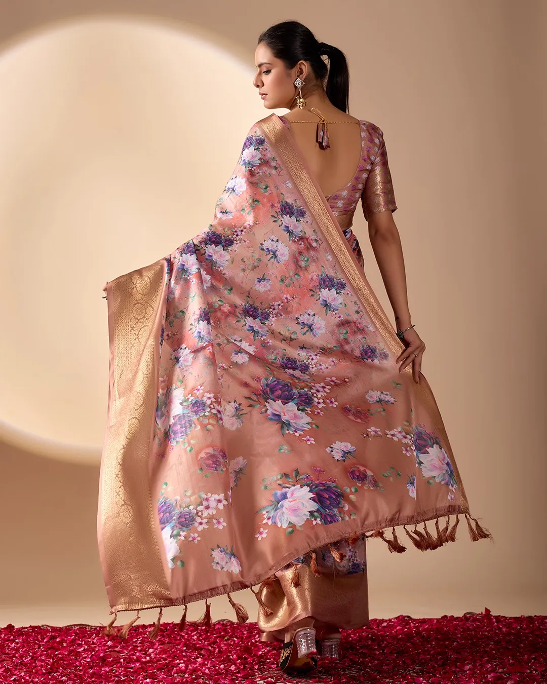Artistry (Body): Features Enchanting Floral Digital Prints spread across the body. This modern technique provides stunning clarity and a rich, detailed color palette, giving the saree an artistic, contemporary appeal.